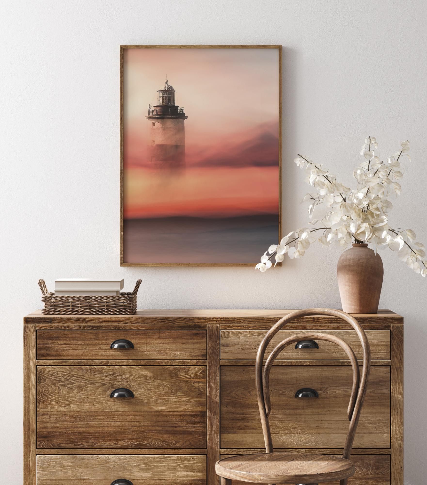 Ett vackert romantiskt tryck av en fyr i havsdimman. De mjuka, rosa pastellfärgerna skapar en känsla av romantik, medan det mjuka blåfärgade havet ger en mörkare ton till denna vackra poster. Känn och hör havsbrisen när du hänger den här bilden i ditt hem.