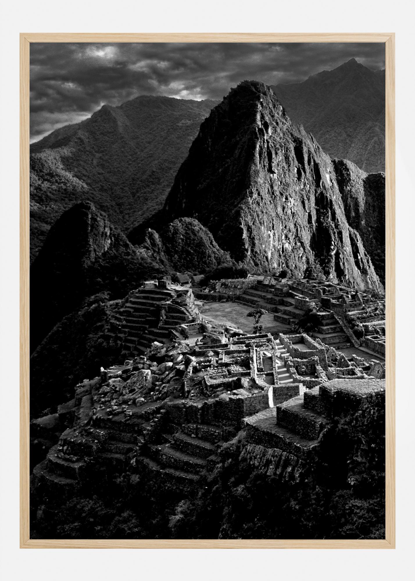 Ett fascinerande svartvitt tryck av inkafolkets förlorade stad. En spektakulär utsikt över ruinerna tar din fantasi tillbaka i tiden. Den svartvita horisonten förstärker det naturliga ljuset som lyser upp mitten av bilden. Häng den här magiska och mystiska postern i din studio och ta ett steg tillbaka i tiden.