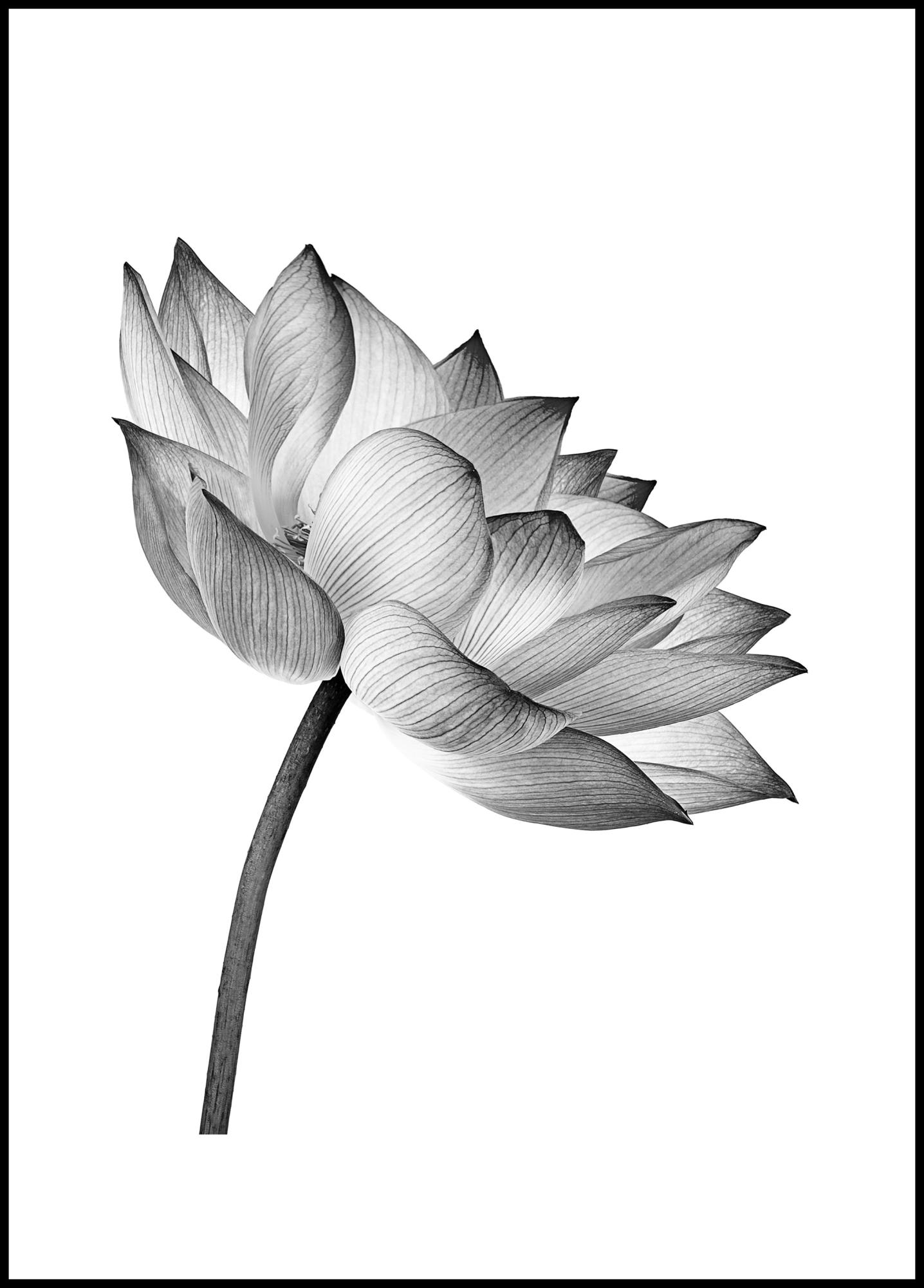 En grafisk poster i svartvitt av en utslagen lotusblomma mot en vit bakgrund. En stilren och minimalistisk poster som är lätt att kombinera med andra favoriter på en större tavelvägg.