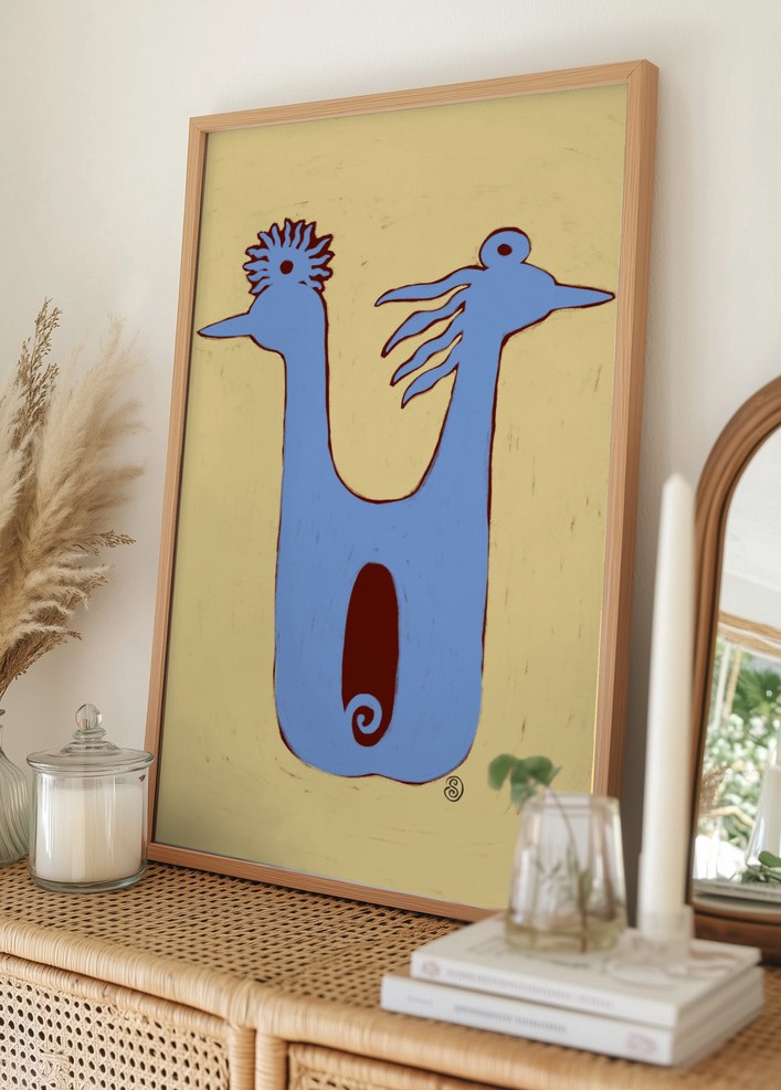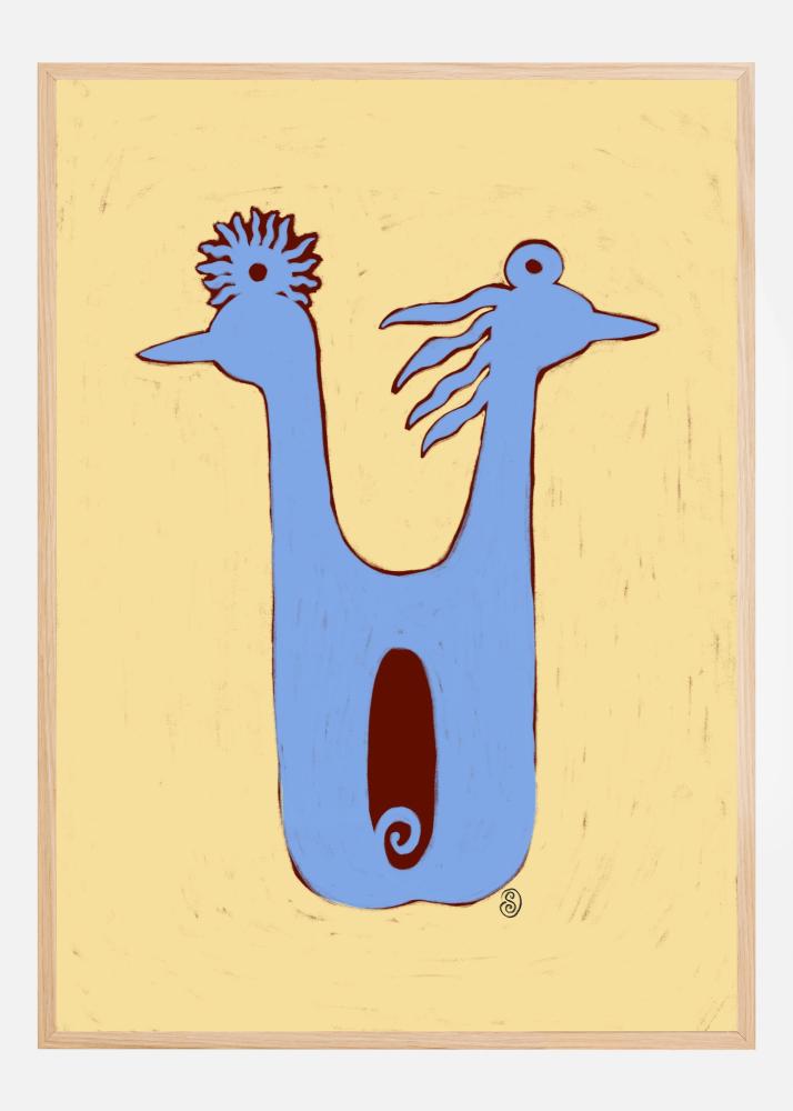 Denna unika poster visar ett kreativt och abstrakt motiv med två fågelliknande figurer. De är illustrerade i en livlig blå nyans som kontrasterar mot en varm gul bakgrund, vilket skapar en iögonfallande och fascinerande bild. De stiliserade figurerna ger ett modernt och konstnärligt uttryck som passar perfekt för att ge ditt hem en uppfriskande touch av trendig design.