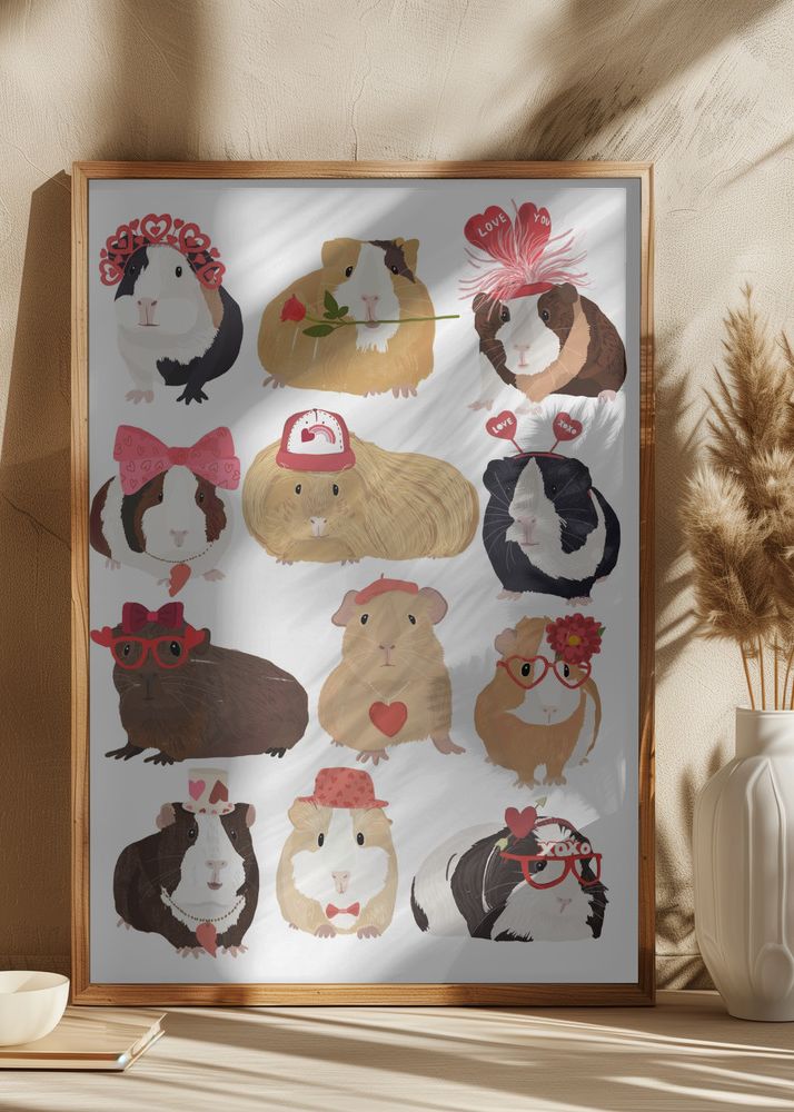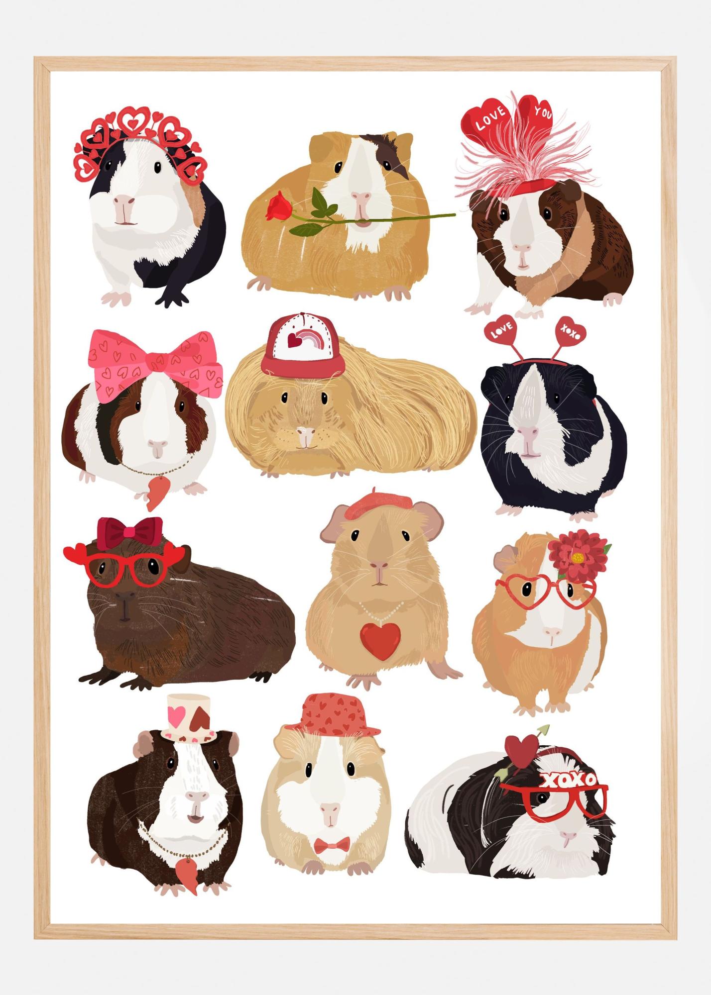 Denna charmiga poster är en sann rattpusslare för alla åldrar tack vare sitt lekfulla motiv av marsvin i olika poser och med söta accessoarer. Kärlekstemat lyser starkt genom de hjärtliga detaljerna och rosetterna, vilka lägger till en känsla av värme och humor i illustrationen. Perfekt för den som önskar addera en dos glädje och personlighet i sitt hem eller som en unik present till en djurälskande vän.
