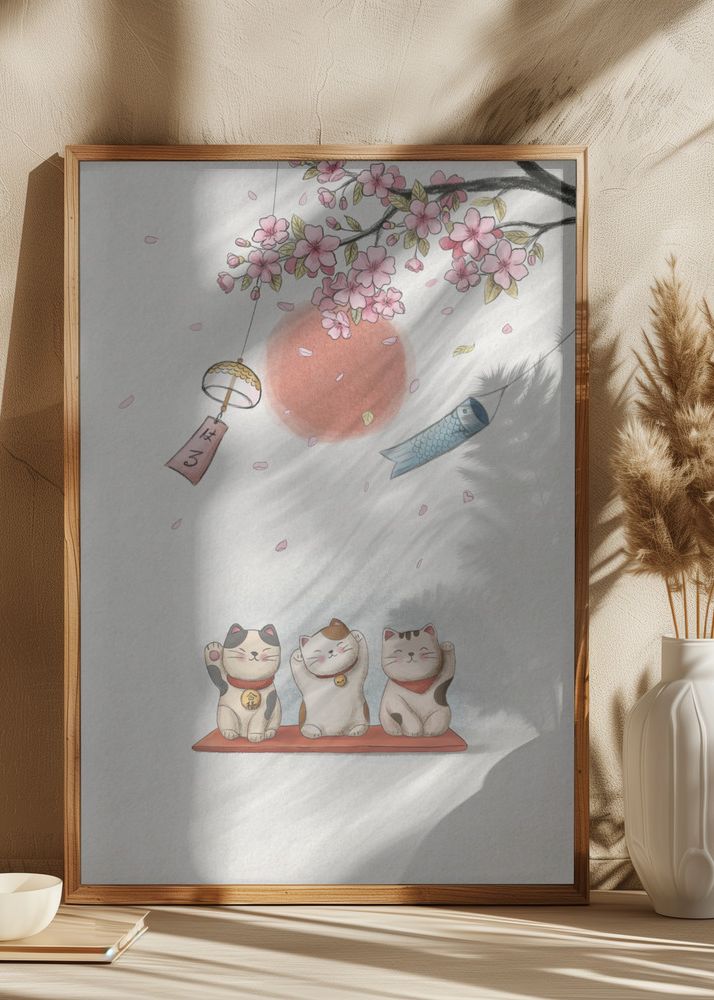 Upplev en touch av japansk estetik med denna charmiga poster som föreställer en rad med tre bedårande manekineko, även kända som lyckokatter. Varje katt har sin unika pose och uttryck, som tillsammans skapar en balanserad komposition full av harmoni och lekfullhet. Printen pryds av en gren med blommande körsbärsblommor, kända som sakura i Japan, som elegant svävar ovanför de små figurerna. De spridda kronbladen runt katterna tillför rörelse och en känsla av liv i denna stillsamma scen.