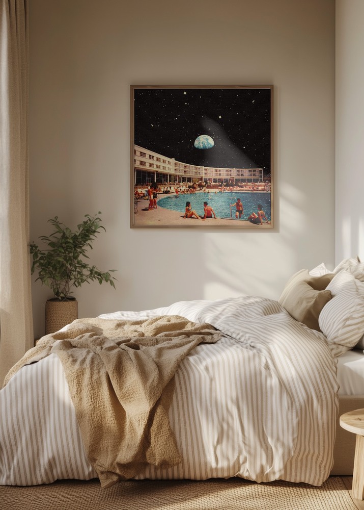 Denna unika poster fångar ett drömlikt scenario där en livlig poolscen kombineras med en surrealistisk rymdutsikt. Motivet visar människor som njuter av sin tid vid en pool under en klar stjärnhimmel, med jorden svävande majestätiskt i bakgrunden. Printet är perfekt för den som vill ha en iögonfallande och samtida affisch att dekorera med.