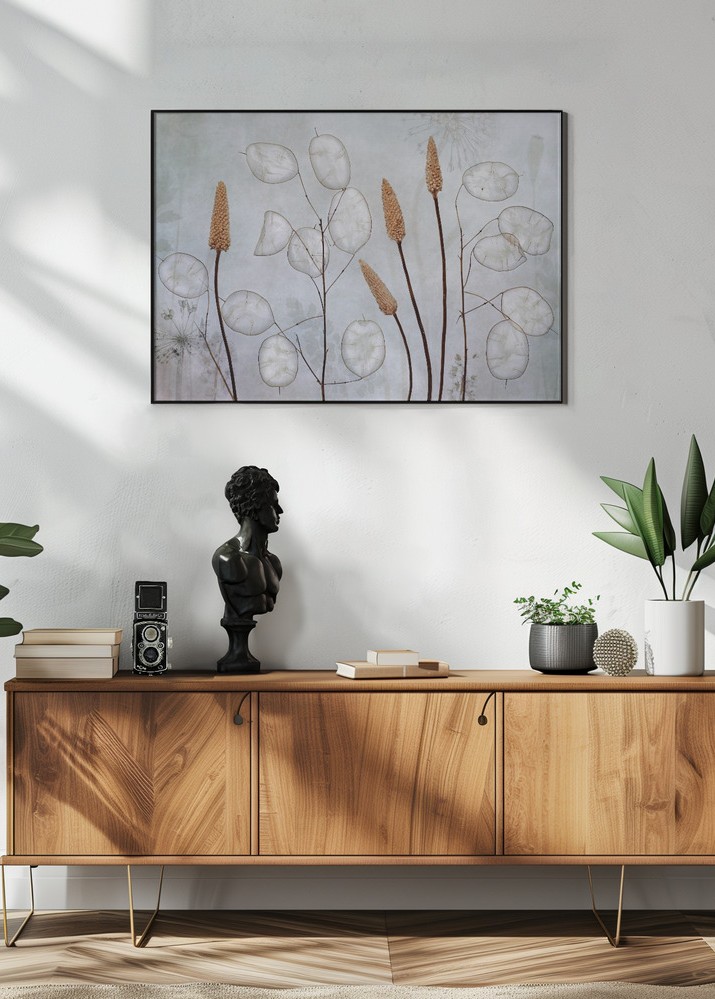 Denna vackra poster fångar sofistikerat naturens skönhet med sina eleganta motiv av skira, genomskinliga fröställningar och ståtliga grässtrån. Framför en mjukt färgad bakgrund framträder motiven med en subtil men ändå slående effekt, vilket gör den till en perfekt centerpiece i vilket rum som helst. Med sin harmoniska komposition förvandlar denna affisch väggarna hemma till en plats av ro och elegans.