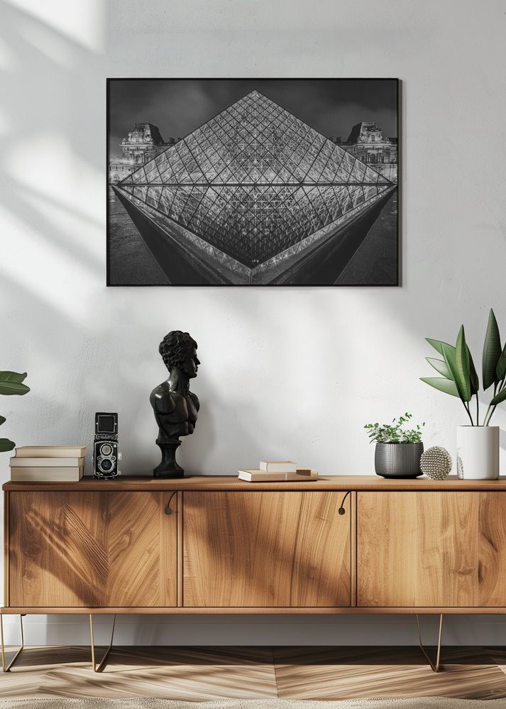 Upplev den ikoniska skönheten av en av världens mest kända arkitektoniska mästerverk med denna stilrena poster av den välkända glaspyramiden. Med en kombination av modernt och klassiskt fångar detta print den fantastiska geometriska formen och reflektionerna som skapar en hisnande effekt. Perfekt för att ge en sofistikerad och tidlös känsla i ditt hem eller kontor.