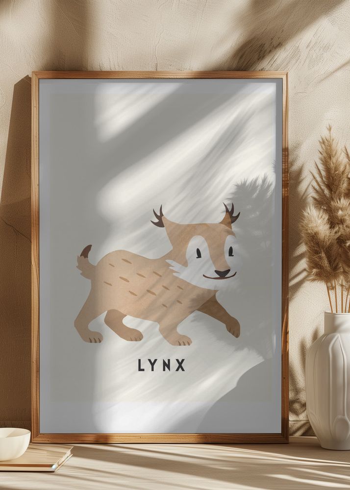 Denna charmiga poster föreställer en lekfull illustration av en lodjur, perfekt för att addera en varm och naturlig känsla i ditt hem eller kontor. Designen är älskvärd och fängslande, med ett modernt och stilrent uttryck som fångar betraktarens uppmärksamhet. Illustrationens mjuka konturer och den vänliga gesten hos lodjuret gör denna print till en favorit för barnrummet eller som en del av en djurtematiserad bildvägg.