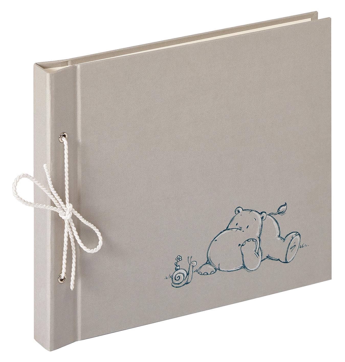 En söt liten person kräver ett minst lika sött fotoalbum! Här har vi ett stilrent babyalbum som är klätt i grå textil och dekorerat med en vit rosett som går genom silverfärgade öljetter. På framsidan finns ett mysigt motiv i form av en liten flodhäst som vickar på svansen och en snigel med en blomma på skalet. Inuti finner du 50 stycken gräddvita sidor som du själv klistrar in dina bilder på. På varje sida finns samma näpna flodhäst intill 4 stycken linjer där du kan skriva något passande.
