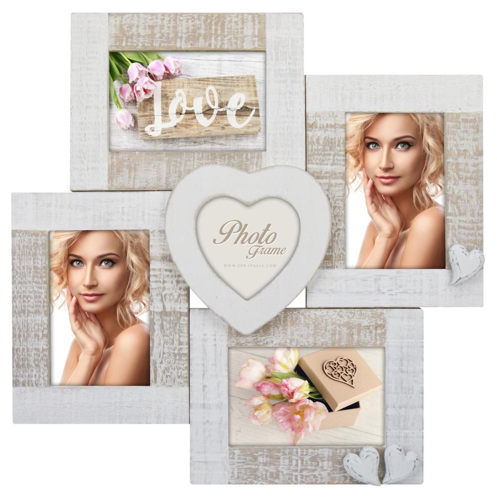 Detta är en fin collageram i romantisk design med dekorativa hjärtan. Collageramen är tillverkad i trä och går i en klassisk vit nyans. Denna ram har plats för 4 bilder i 10x15 cm och 1 mindre bild i 10x10 cm. Väggfäste finns. Ramens yttermått mäter 43x43 cm.