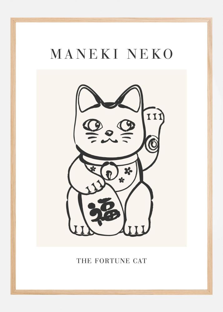 Denna charmiga poster föreställer den ikoniska och välkända japanska symbolen Maneki Neko, allmänt känd som "The Fortune Cat". Denna lyckobringande katt är gestaltad i en enkel och grafisk stil, med rena linjer och distinkta detaljer som ger en modern touch till det traditionella motivet. Illustrationen är utförd i svart på en klar vit bakgrund, vilket skapar en stark kontrast och gör denna print till ett perfekt tillskott för de som vill ha en minimalistisk men samtidigt kulturellt signifikant inredningsdetalj.