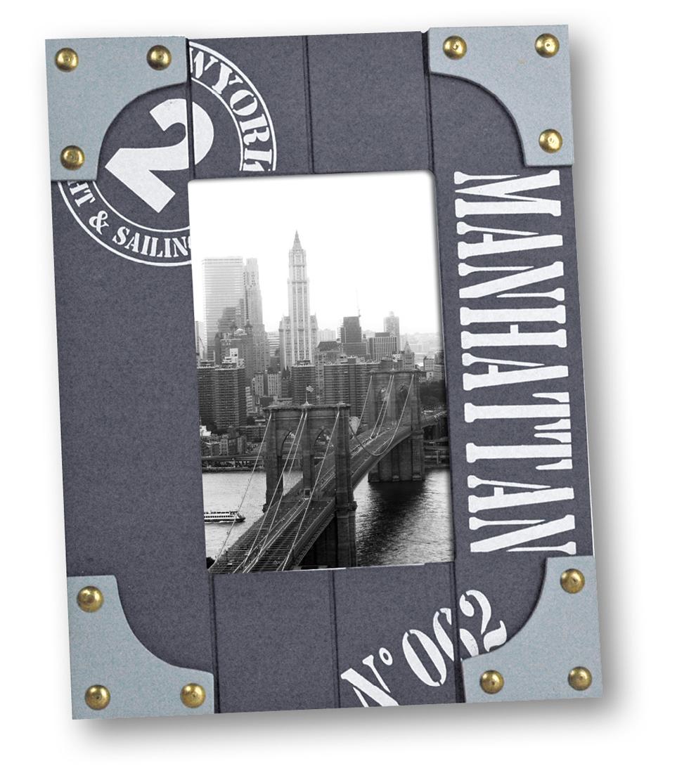 Retroinspirerad fotoram med mörkgrå bakgrund med tydliga referenser till New York och Manhattan. Ramen har en unik design med upphöjda ljusgrå hörn prydda med snygga nitar av mässing.