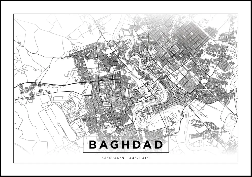 Här är en klassisk och stilren kartposter över Baghdad i ett liggande format. I ett minimalt rutnät snidas stadens gator och torg fram i svart mot en vit bakgrund. I norr och söder tonar stadskartan ut och ramas in av en tunn svart linje. Nertill i kartbilden står Baghdad tryckt i stora bokstäver och därunder stadens koordinater. Kartans ram återfinns i samma stil runt stadens namn och hela bilden i sig omges av en bred vit marginal som snyggt och smidigt för in blicken mot posterns motiv. En snygg och stilfull kartposter som passar in i hemmets alla rum!