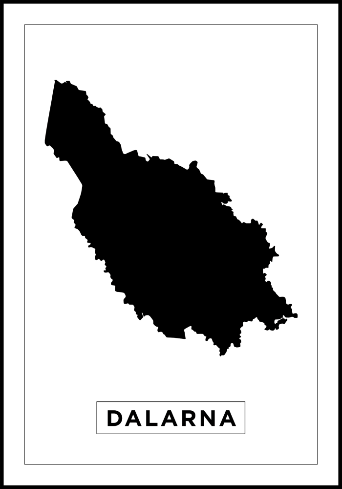 Pryd din vägg med den här härligt minimalistiska kartpostern över Dalarna! Centrerat i bild breder landskapet ut sig i svart mot en vit bakgrund. Nertill står Dalarna tryckt i stora svarta bokstäver, inramat med en tunn svart linje. Runt landskapsnamnet och landskapet i sig finns ytterligare en svart ram i samma stil och utanför den en lite bredare marginal i vitt.