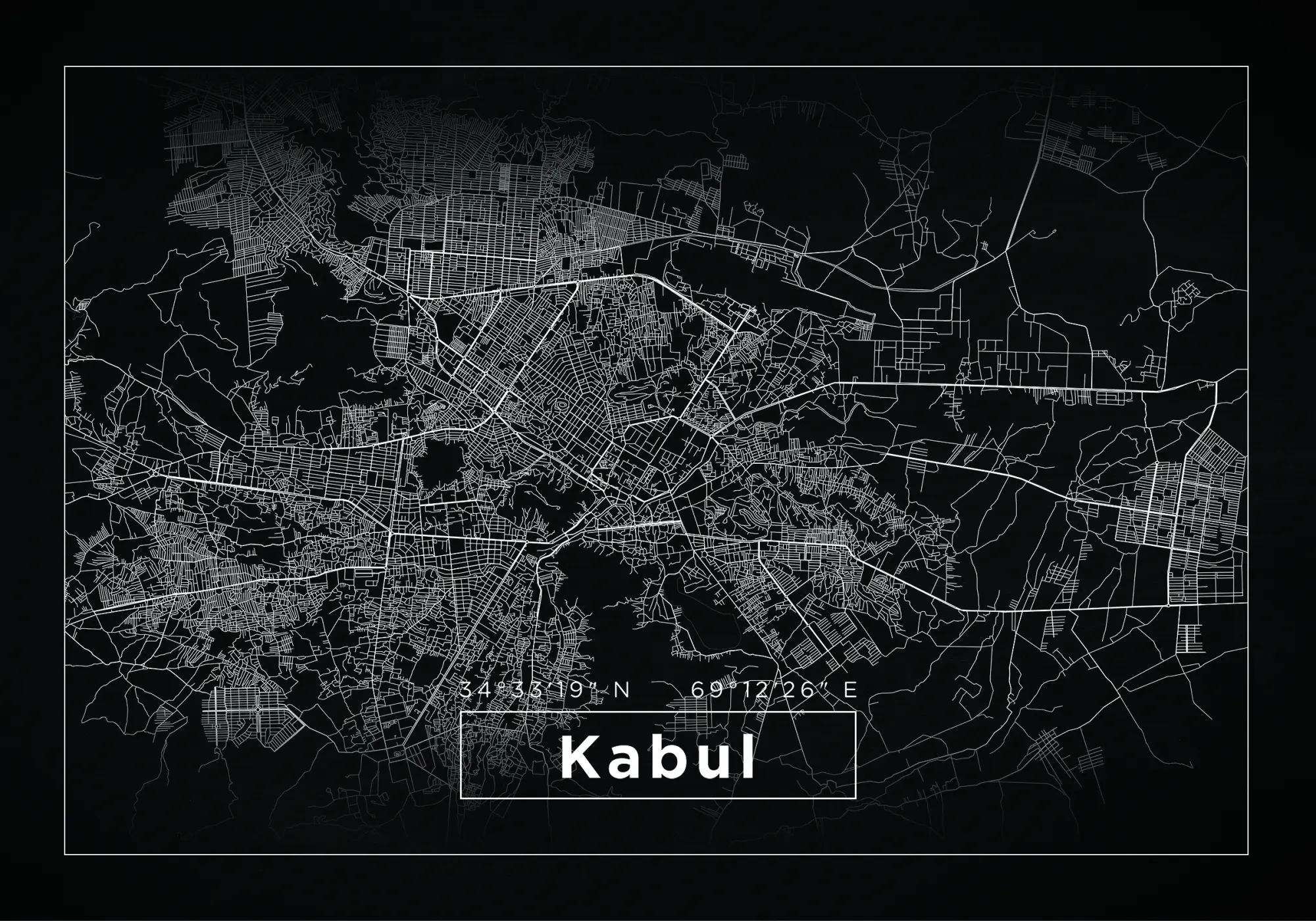I den här stadskartan breder Kabul ut sig i ett liggande format i vitt på svart. Med ett utryck som för tankarna mot ett negativ snidas stadens gator och torg fram i ett stort minimalistiskt rutnät som upptill och nertill i bild tonar ut och omges av en tunn ram i vitt. Nertill i bild står Kabul tryckt och inramat på samma sätt som kartan i sin helget och ovanför står stadens koordinater. En fantastiskt läcker kartposter som skapar det där lilla extra blickfånget till just din vägg!