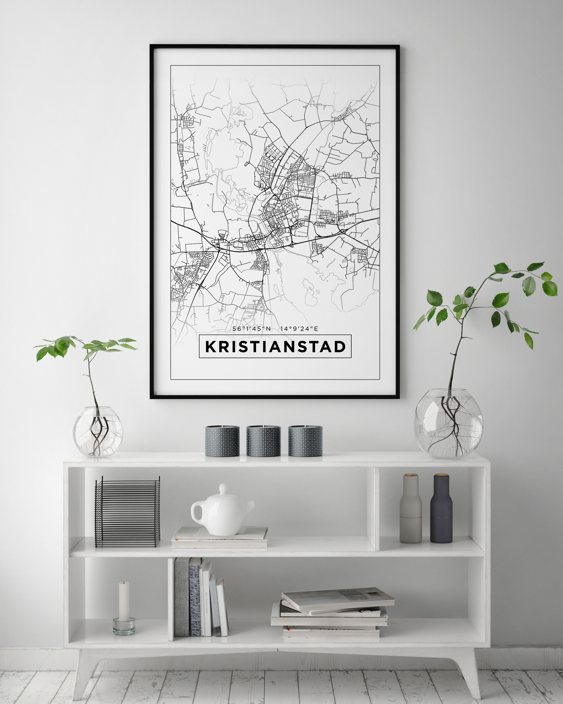 Här har vi stadskartan för den som vill hylla Kristianstad lite extra. De svarta linjerna som markerar stadens alla gator tonar ut upptill och nertill i bild för att sedan mötas av en tunnare ram i svart. Utanför den svarta ramen finns en lite bredare marginal i vitt. Nertill på stadskartan står Kristianstad tryckt i svarta versaler och inramad i samma snitt som kartan i sin helhet. Ovanför Kristianstad står de siffror som anger områdets korrdinater. En snygg och stilren kartposter för den som älskar Kristianstad!