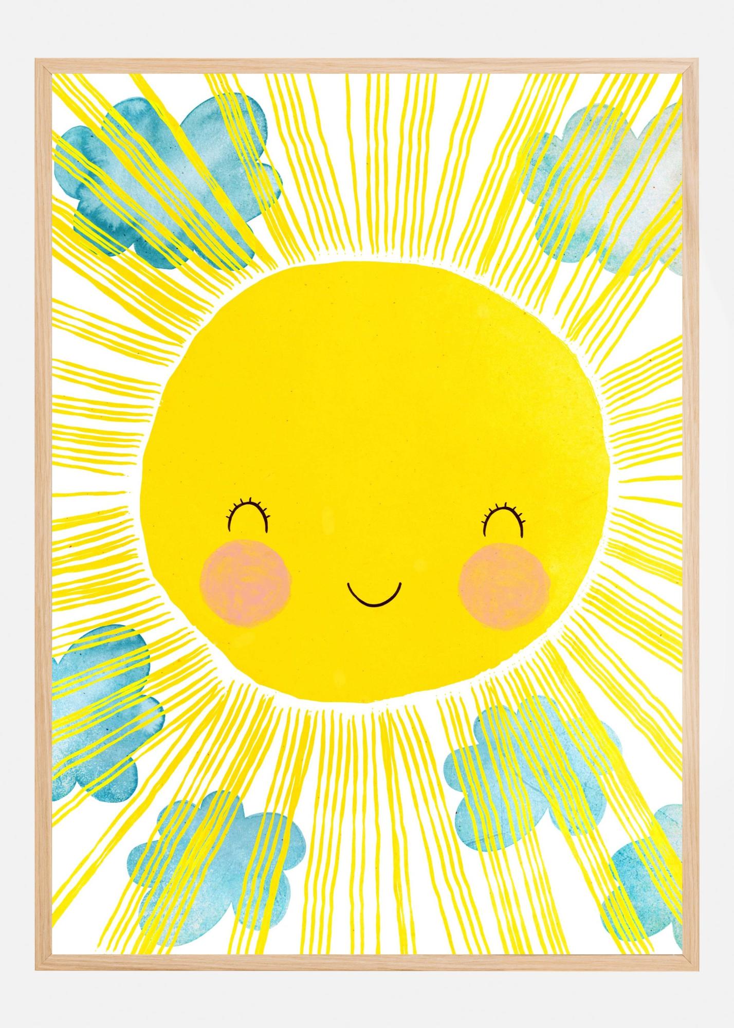 Denna charmiga affisch kommer att sprida solsken i vilket rum som helst med sitt leende solmotiv mitt i bilden. Den strålande gula nyansen av solen, ackompanjerad av solstrålarna som sträcker sig utåt, skapar en känsla av värme och glädje. Detta print är perfekt för att lägga till en pop av färg och positivitet i hemmet eller på kontoret.