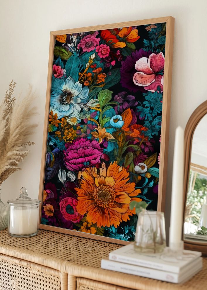Denna färgsprakande poster fångar ögat med sitt livfulla blommotivs detaljerade design. Blommorna är konstfullt arrangerade och presenterar en harmonisk blandning av färger som inkluderar livliga nyanser av orange, rosa, blått och lila. De olika blommorna står ut mot en djup, mörk bakgrund som skapar en dramatisk kontrast och framhäver varje blommas unika former och färger.