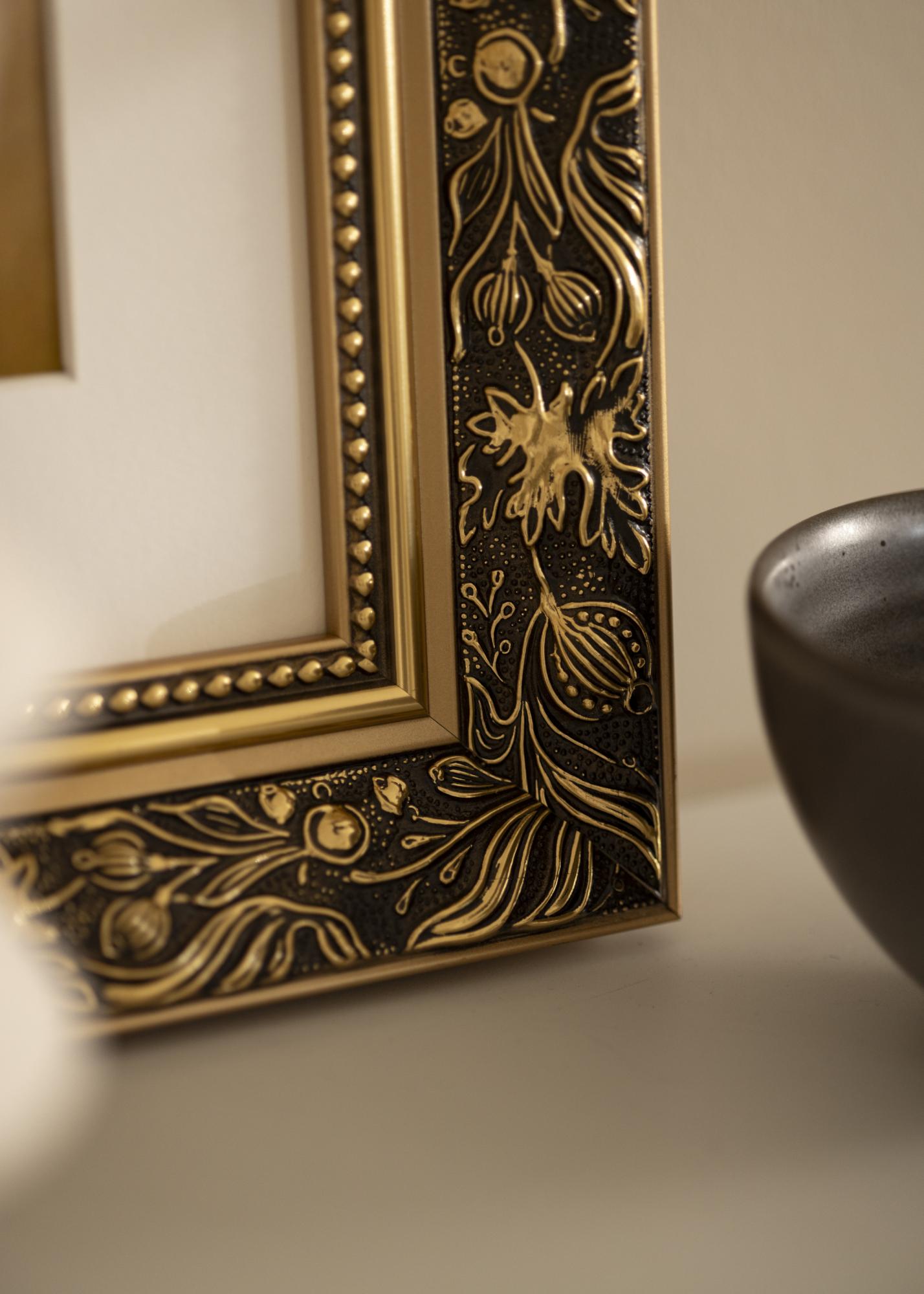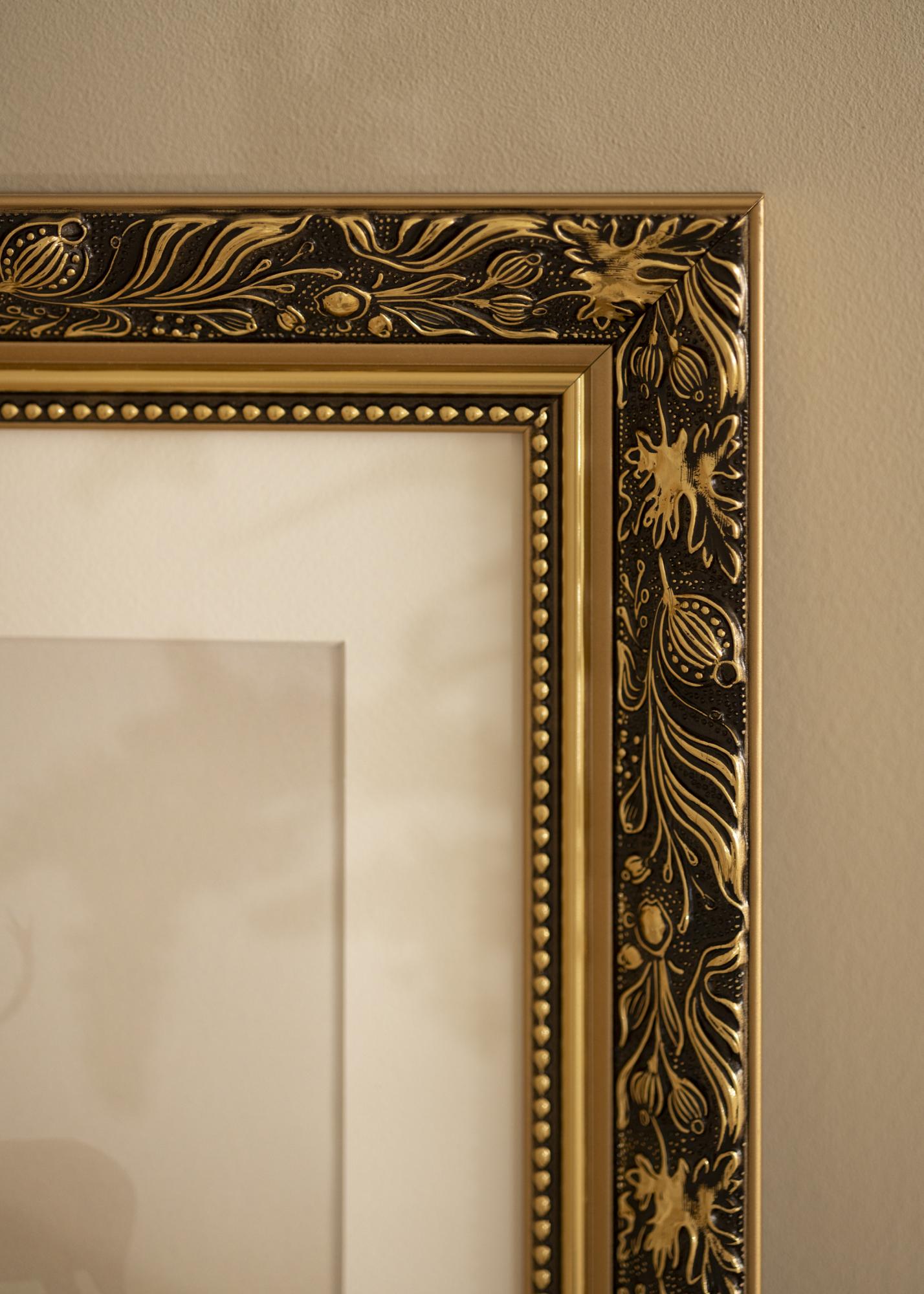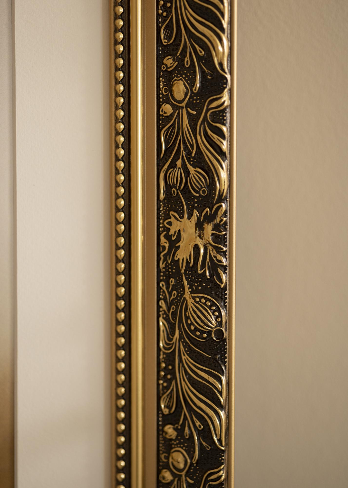 Ta dina bilder till nya höjder med denna lyxiga tavelram! Ramen har en dubbel profilering som gör sig mycket fin på väggen. Kanterna går helt i guld medan framsidan är svart och har ett guldfärgat, vackert mönster med blad och snirkliga former. Närmast glaset löper en guldfärgad kant och ett svart parti med ett pärlmönster i guld. Eftersom ramen tillverkas efter dina måttangivelser kan du vara säker på att den passar precis där du vill ha den.