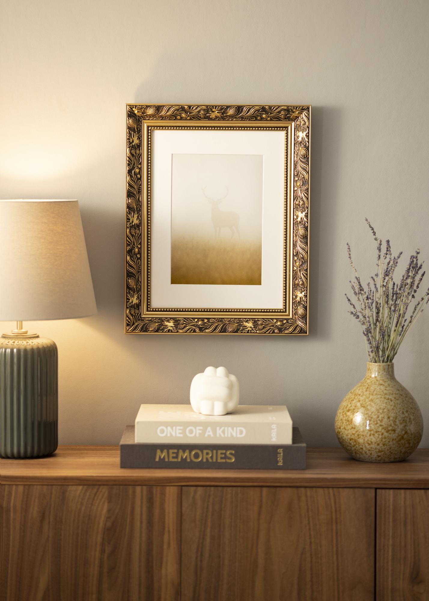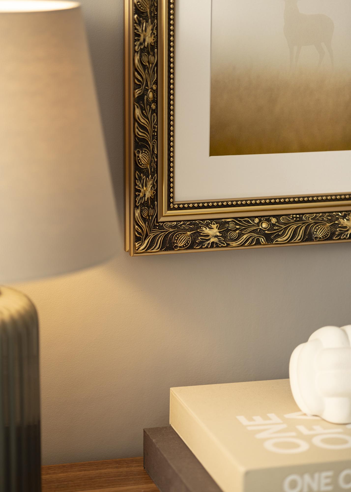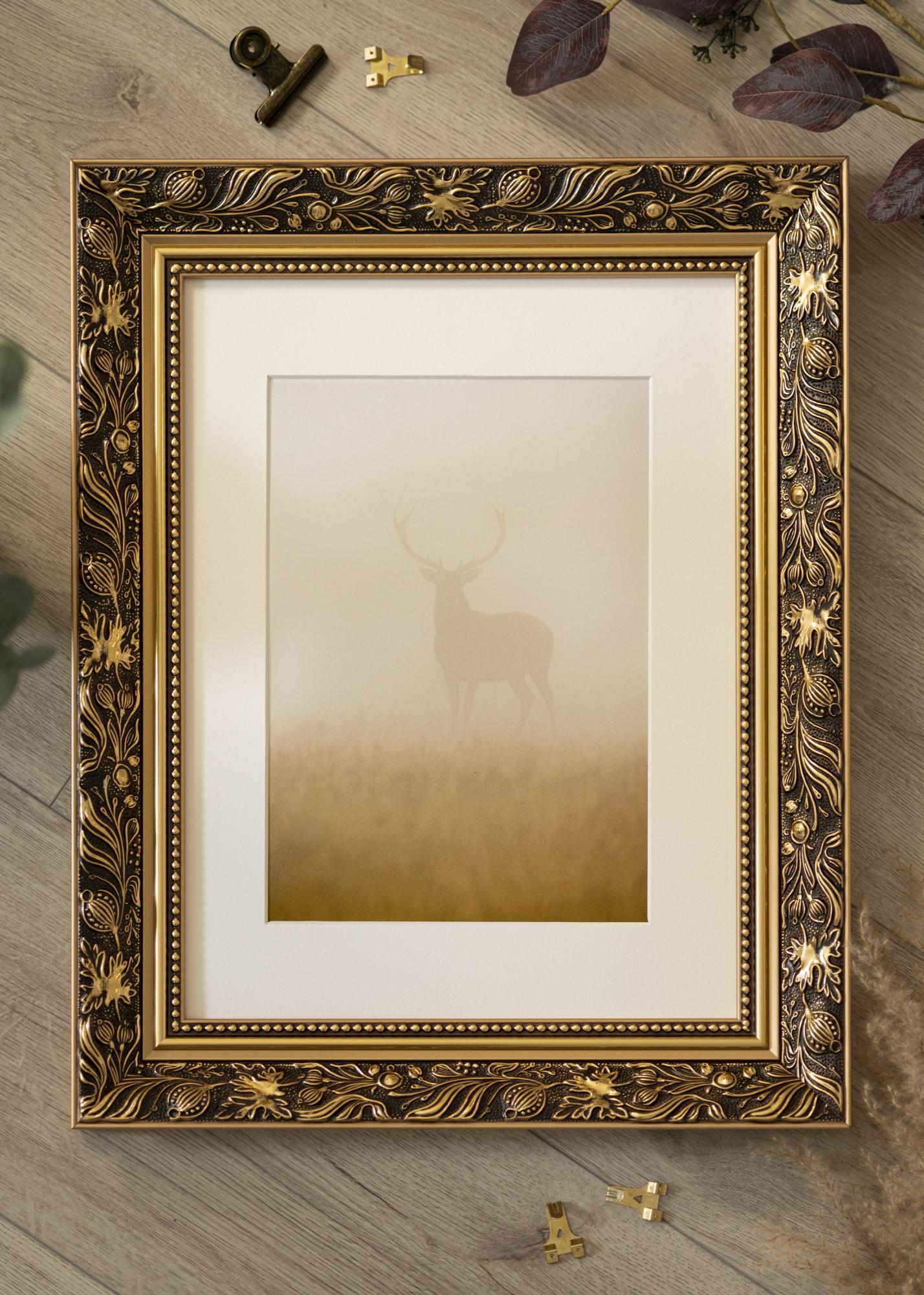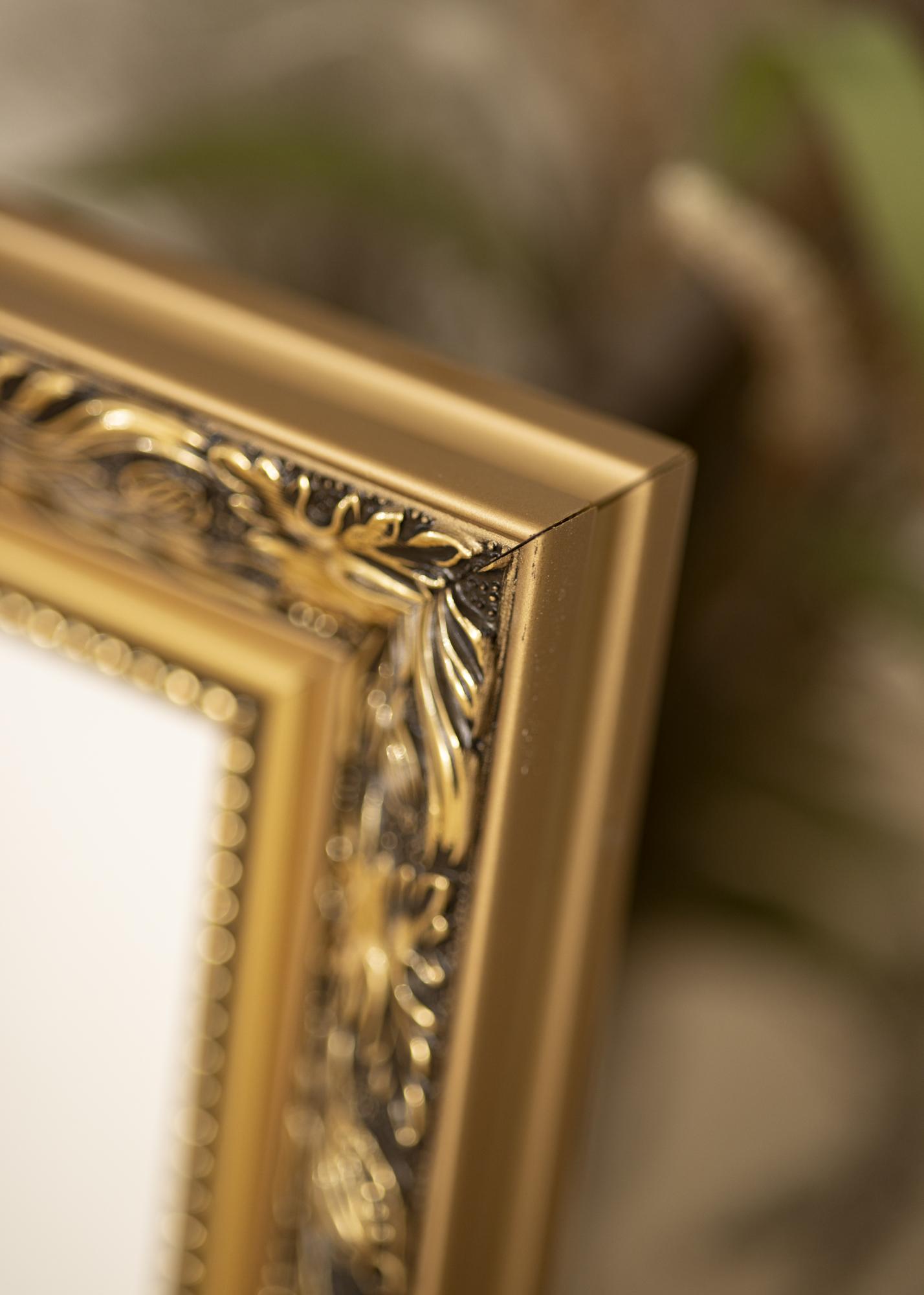Ta dina bilder till nya höjder med denna lyxiga tavelram! Ramen har en dubbel profilering som gör sig mycket fin på väggen. Kanterna går helt i guld medan framsidan är svart och har ett guldfärgat, vackert mönster med blad och snirkliga former. Närmast glaset löper en guldfärgad kant och ett svart parti med ett pärlmönster i guld. Eftersom ramen tillverkas efter dina måttangivelser kan du vara säker på att den passar precis där du vill ha den.