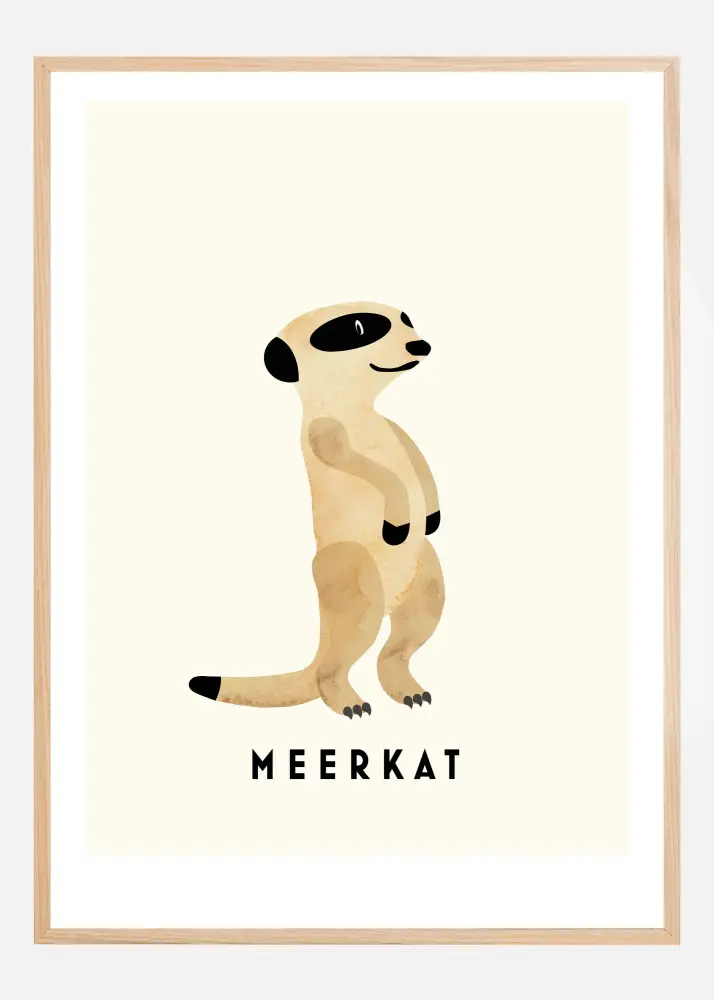 Färgpaletten i denna print är mjuk och jordnära, med nyanser av beiget, brunt och svart, vilket kompletterar motivets naturliga ästetik. Texten "MEERKAT" under bilden är en stilig detalj som adderar ett modern och informativt element till designen. Väggkonsten är omgiven av en ljus bakgrund som framhäver illustrationen och gör den till ett smakfullt tillskott till såväl minimalistiska som bohemiska inredningsstilar.