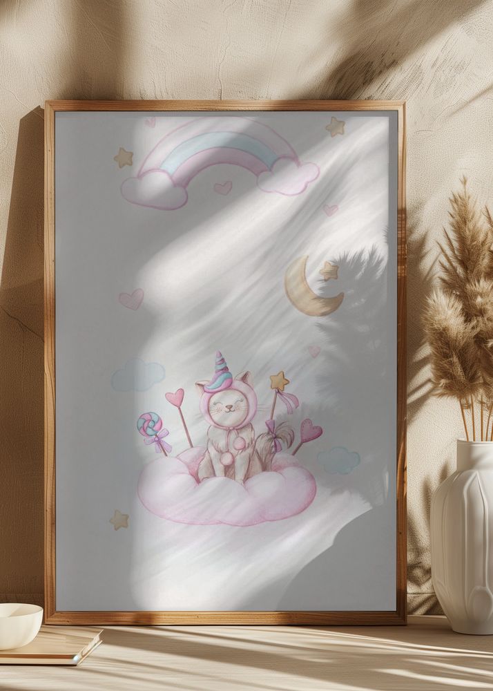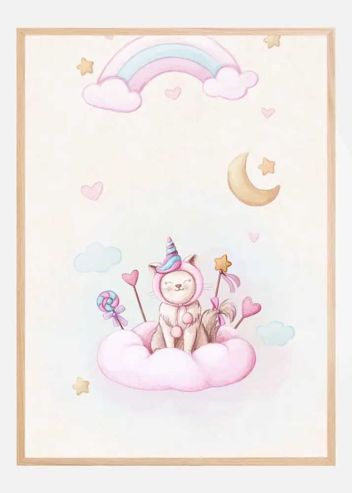 Denna förtjusande poster föreställer en söt katt som sitter bekvämt på ett rosa moln, omgiven av många lekfulla element som kommer att fånga betraktarens öga. Motivet inkluderar en pastellfärgad regnbåge, små stjärnor, hjärtan och moln som sprider en känsla av lätthet och fantasi. De huvudsakliga färgerna i denna affisch är milda och lugnande nyanser av rosa, blått och gult, med inslag av vit och guld som ger konstverket en mjuk och drömsk kvalitet, perfekt för att addera en söt touch till varje barnrum eller lekrum.