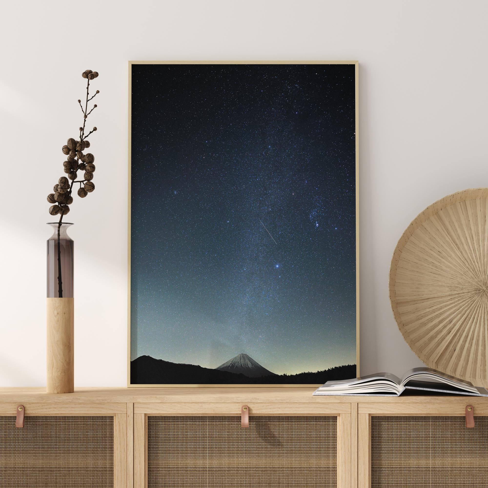 En vacker poster med en natthimmel och en meteor. Med ett snötäckt berg som syns i fjärran finns det en mystisk känsla över de magiska vita stjärnorna. En stråle av naturligt ljus skiner bakom berget och skapar den magiska och mystiska känslan. Perfekt för ett barnrum.