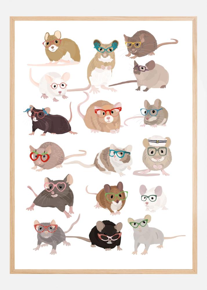 Denna lekfulla och charmiga poster är en riktig pärla för alla djurälskare och glasögonfantaster. Motivet innehåller en serie av illustrerade råttor i olika nyanser och storlekar, var och en med ett unikt par glasögon som tillför en humoristisk touch. Från en klok professor-look med runda bågar till en trendig cat-eye modell, skapar dessa råttor en rolig mix att hänga på väggen i ett barnrum, studiehörnan eller varför inte i optikerbutiken!