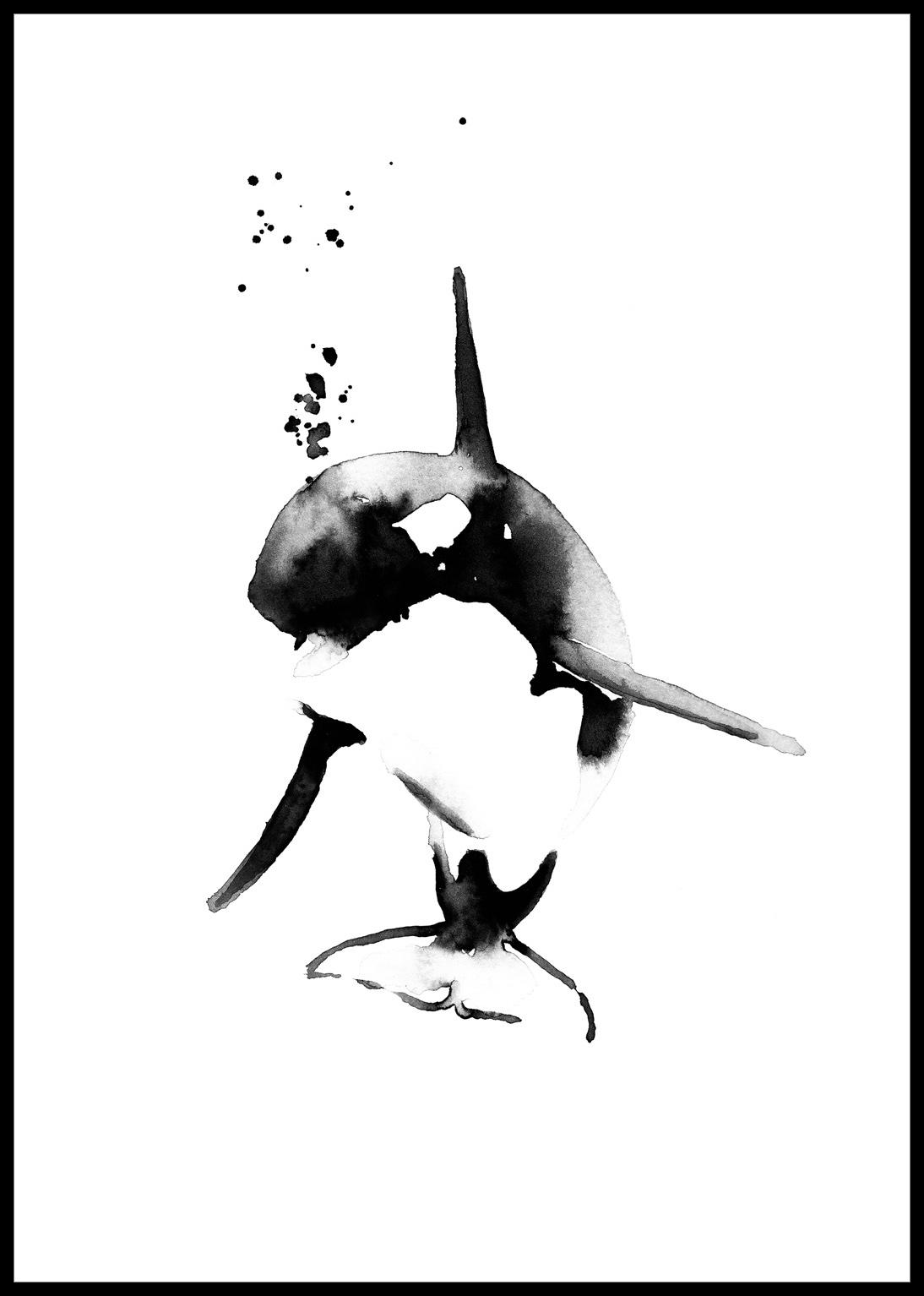 Spännande affisch med en illustration av en späckhuggare, tandvalen som både ingjuter både skräck och fascination i oss. Originalet är målat i svart akvarell och postern passar fint in i barnrummet, men även på en vägg med djurbilder i övriga hemmet. Rama in trycket i en stilren tavelram för att framhäva motivet.