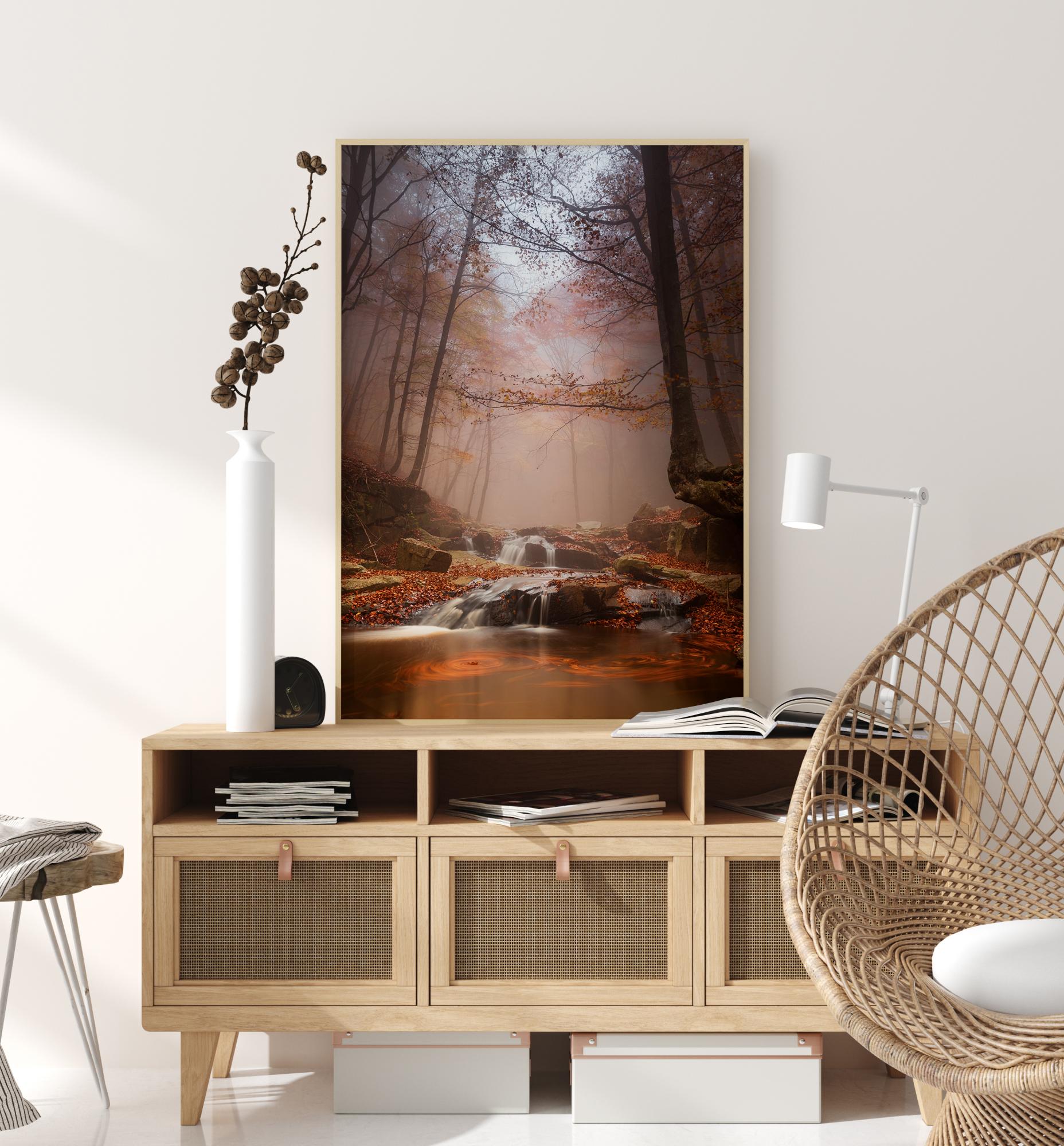 Ett naturskönt porträtt av en dimmig skog med en vacker bäck. Dimman blockerar det direkta solljuset och endast vissa strålar lyser upp den disiga skogen och framhäver de bruna och gula bladen. I förgrunden ligger höstfärgade löv på flodbanken. Den här postern är redo att ge ditt hem en naturskön och stenigt kuperad skogsutsikt.