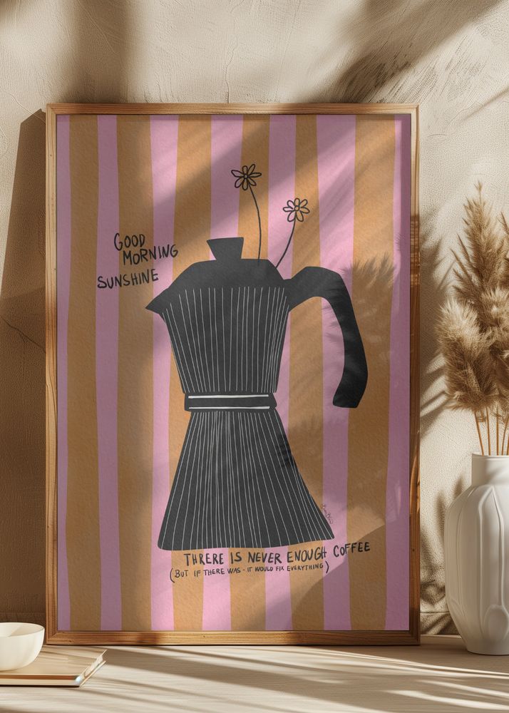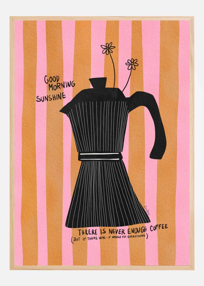 Denna charmiga och trendiga affisch präglas av en lekfull blandning av typografi och illustration som tillför en varm och välkomnande stämning till vilket rum som helst. Motivet visar en stiliserad svart kaffekanna centrerad framför en rosa bakgrund med vertikala ränder. Över kaffekannan står texten "GOOD MORNING SUNSHINE" i en handskriven stil, medan längre ned står budskapet "THERE IS NEVER ENOUGH COFFEE (BUT IF THERE WAS - IT WOULD BE EVERYTHING)" på en ombonad och tilltalande sätt.