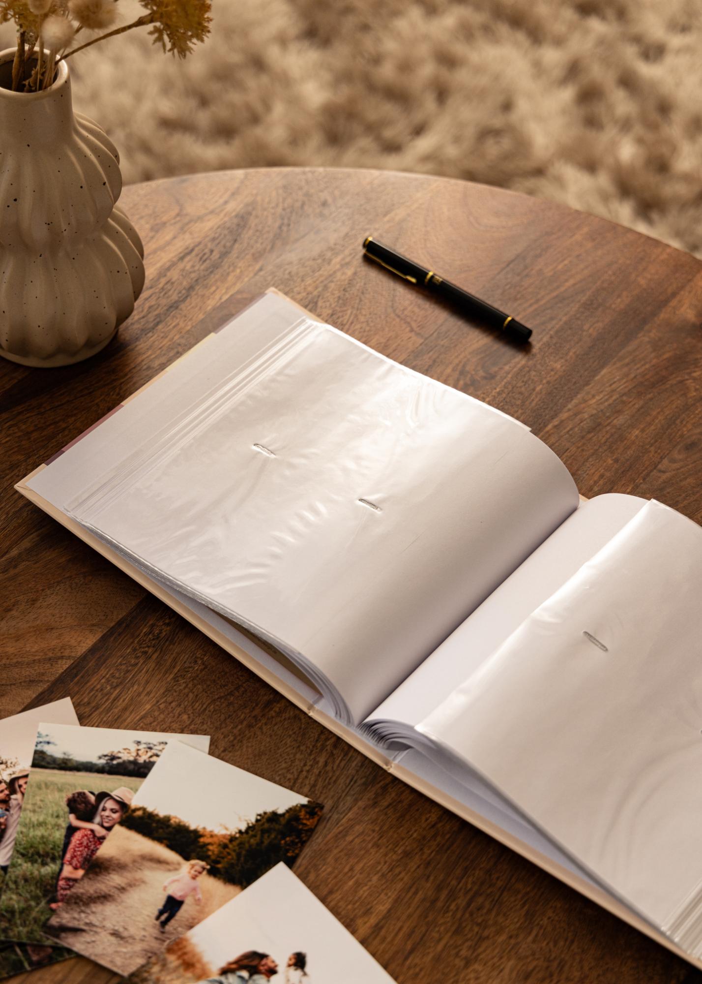 Albumets pärmar är eleganta och ger ett tidlöst intryck, vilket gör det till en vacker inredningsdetalj i ditt hem. Bilderna monteras enkelt i fotofickor, vilket skyddar dem från damm och slitage samtidigt som de är lätta att byta ut vid behov. Bildorienteringen i albumet är liggande, vilket ger en harmonisk presentation av dina fotografier.
