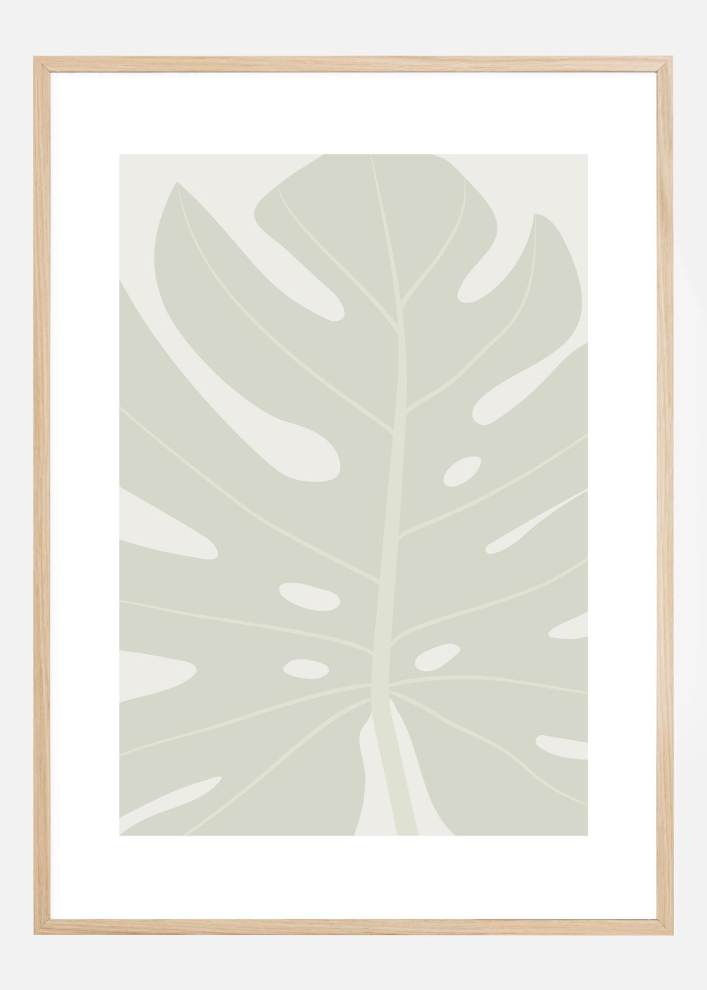 En spännande poster med ett Monstera-teblad ritat på en mörk rektangel på en vit yta. På trycket har bladets sågformade blad vackert böjda och några har skurits ut ur bilden. Ögonliknande mittstrukturer kommer ge ditt hem en spännande känsla.