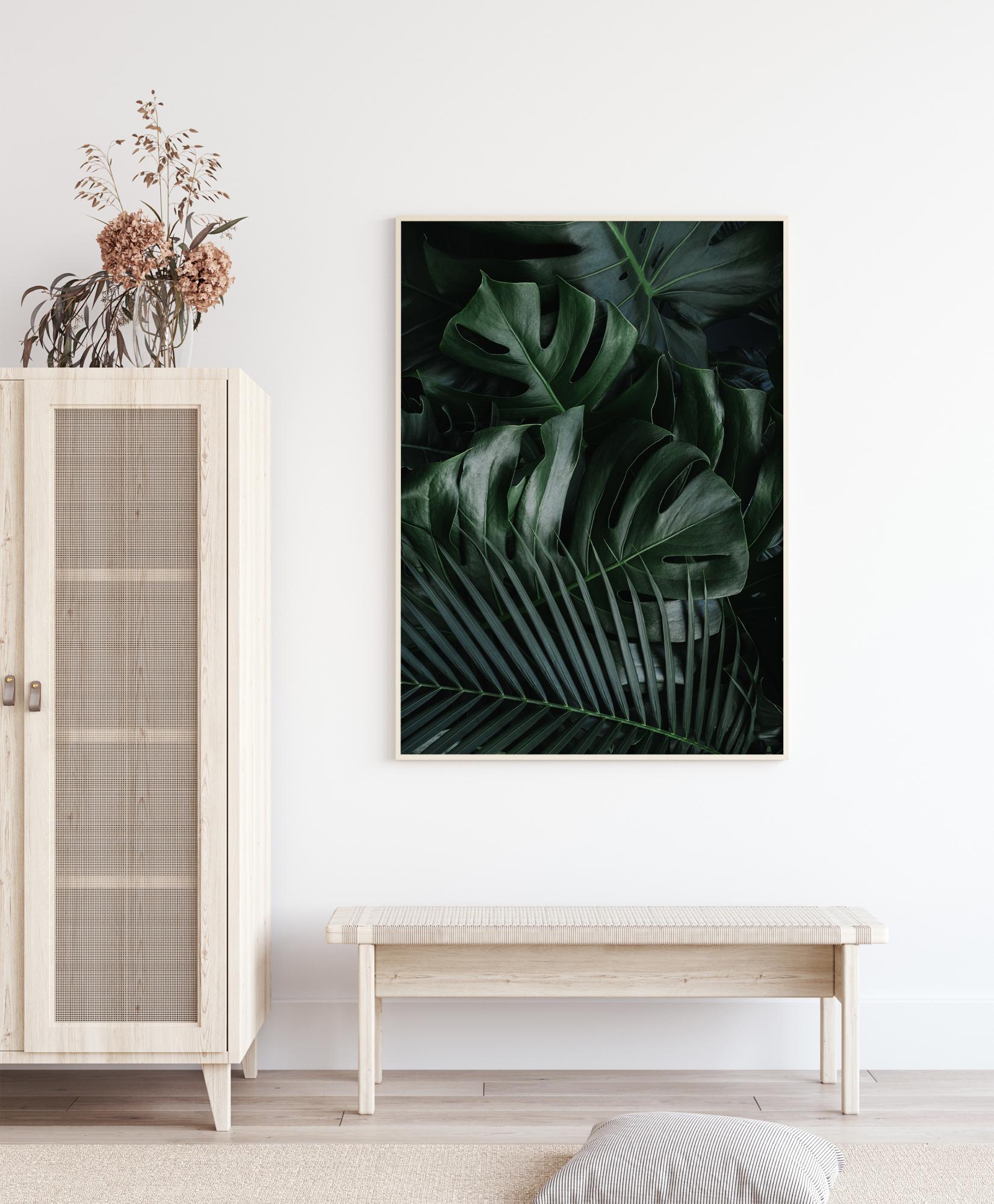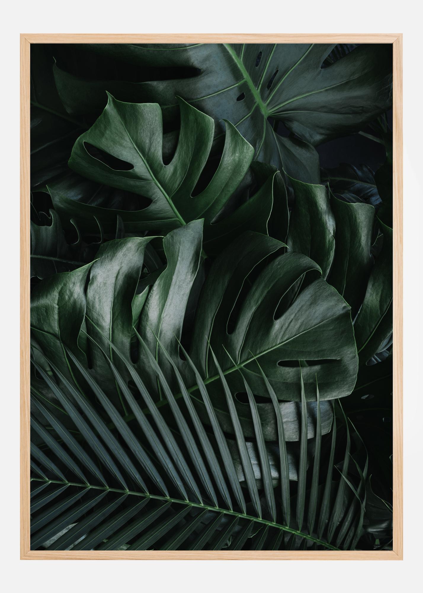 Ett lövigt porträtt av gröna Monstera- och palmblad. Det naturliga ljuset lyser på de övre monstera-bladen och skapar mörkare nyanser i den övre delen av trycket. De sågformade bladen skapar en varm avslappnande känsla. En perfekt poster för alla som älskar växter.
