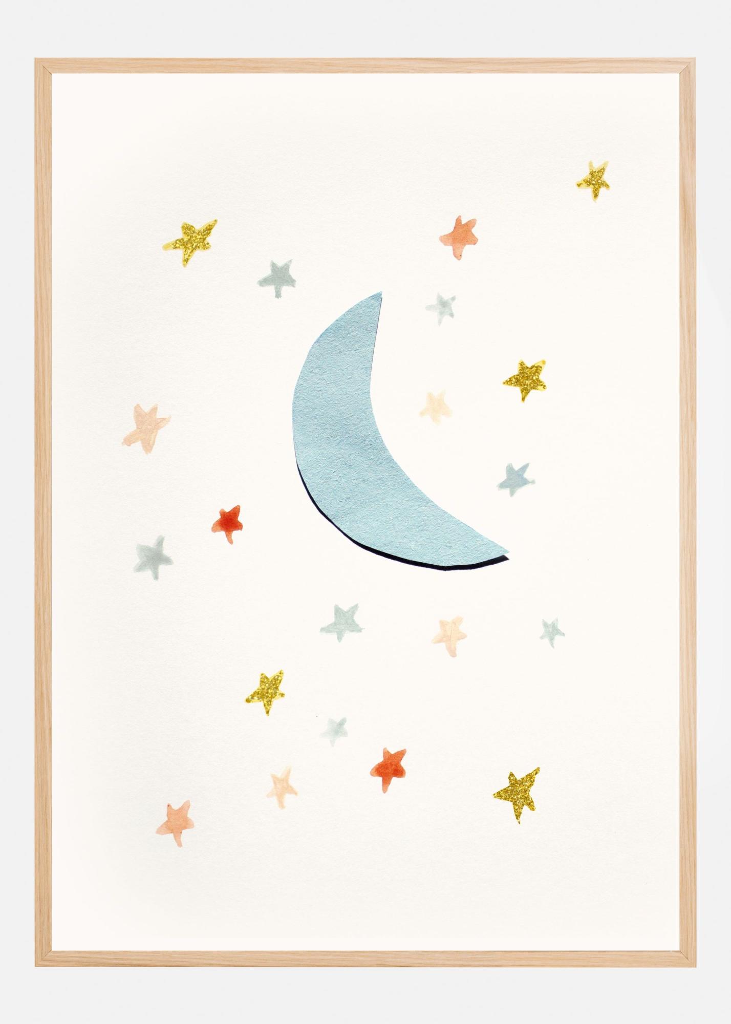 Ge ditt hem en känsla av lugn och ro med denna charmiga poster som framhäver en sval, blå måne omgiven av en samling stjärnor. Detta minimalistiska motiv passar perfekt i ett sovrum eller barnrum, där den bringar en mjuk och avkopplande atmosfär. Posterens färgpalett är diskret med pastelltoner i blått, gult, orange, grått och grönt, vilka bidrar till den lugna och drömska känslan.