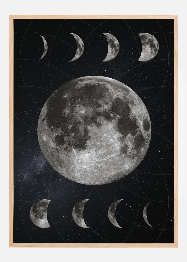 Vilken är din favorit bland himlakropparna? Denna stilfulla print föreställer vår vackra måne och alla dess faser som de ser ut beroende på om du befinner dig på jordens norra eller södra halvklot. Själva månen går i gråskala medan stjärnhimlen bakom lutar lätt åt blått.