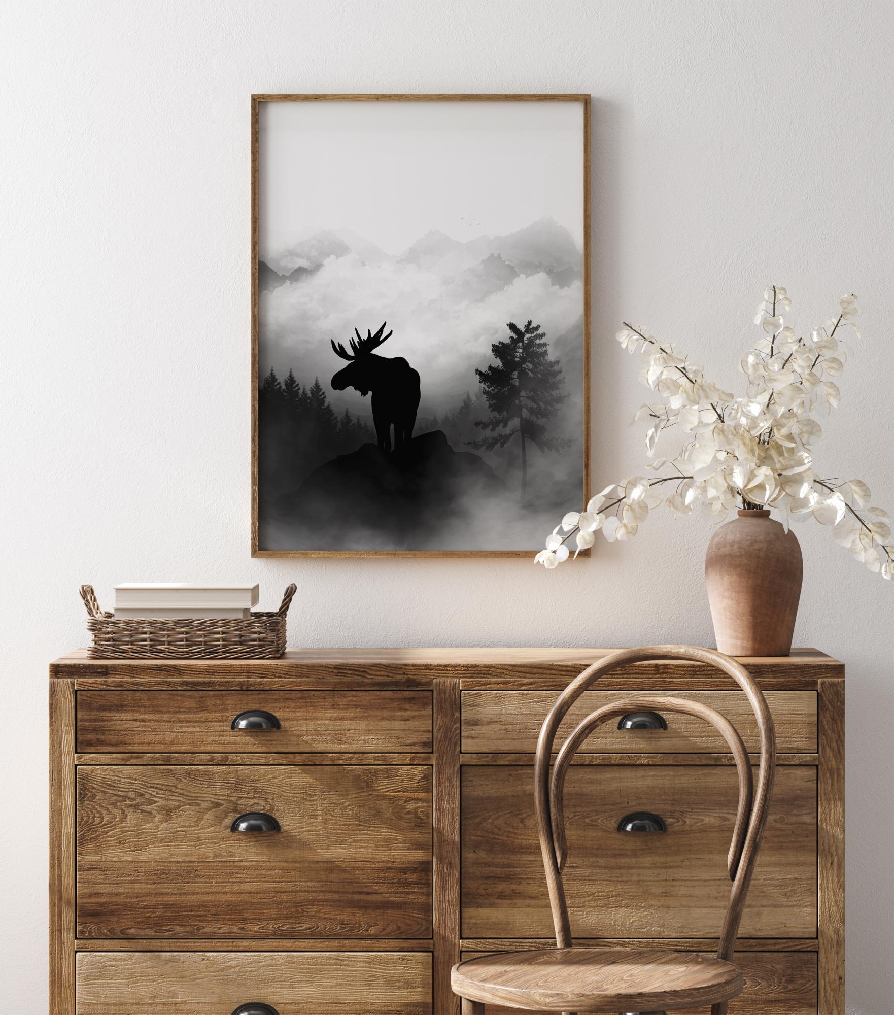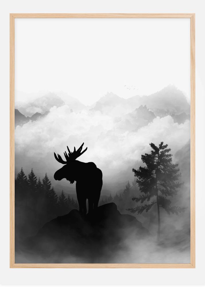 Naturnära grafisk konst av en ståtlig älg omgiven av skog och dimhöljda berg, skapad av Gabriella Roberg. En snygg och stilren poster i svartvitt med en härlig illustration av skogens konung.