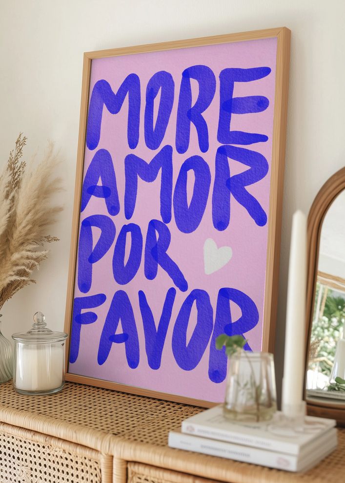 Denna färgglada poster fångar ögat med sina starka kontraster och budskapet "More Amor Por Favor" som står i stora, handskrivna bokstäver. Texten är djupt blå och står ut mot en ljusrosa bakgrund, vilket ger ett levande och energiskt uttryck. Ett litet vitt hjärta i motivet förstärker känslan av värme och kärlek, vilket gör denna affisch till ett perfekt inslag i ett modernt hem.
