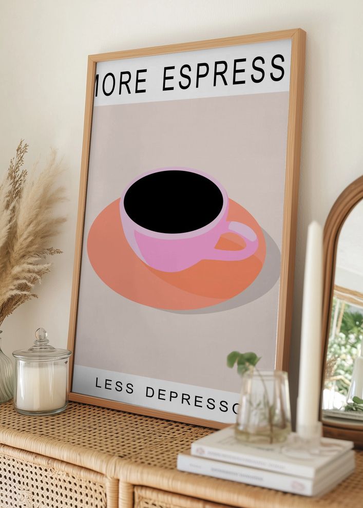 Denna trendiga poster är perfekt för kaffeälskare med sin minimalistiska design och moderna budskap: "More Espresso, Less Depresso". Motivet visar en stiliserad kaffekopp i en vibrant rosa nyans, placerad mot en ljusbeige bakgrund. Kaffekoppen kastar en skugga i en varm aprikosfärg, vilket ger en subtil tredimensionell effekt och gör denna affisch både iögonfallande och stilren.
