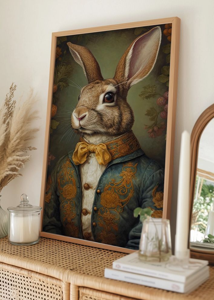 Den här eleganta postern föreställer en ståtlig kanin klädd i historiska kläder, vilket ger en klassisk och tidlös känsla till ditt hem. Med en detaljerad brokadjacka och en stilfull rosett, fångar detta print ett charmigt möte mellan natur och kultur. Kaninens uttrycksfulla och kloka blick förstärker den sofistikerade atmosfären som motivet förmedlar.