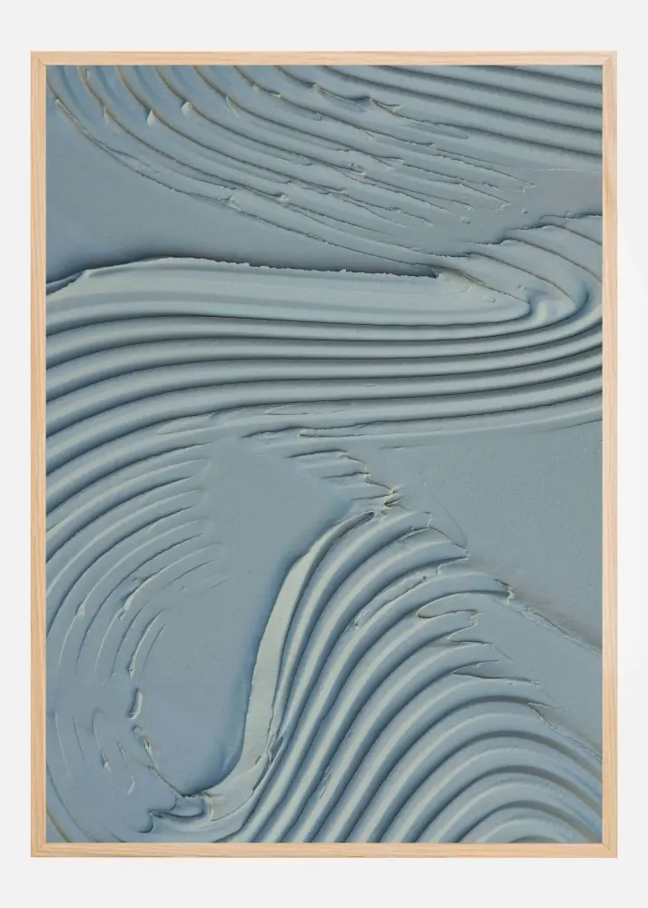 Upptäck lugnet och harmonin i vår abstracta poster som skildrar subtila, vågliknande strukturer. Denna unika print bjuder på en taktil upplevelse genom dess texturerade yta, vilket gör att betraktaren kan förlora sig i dess detaljer. Dess sofistikerade och enkla komposition gör den till ett idealt val för de som vill tillföra ett stämningsfullt element till sin heminredning.