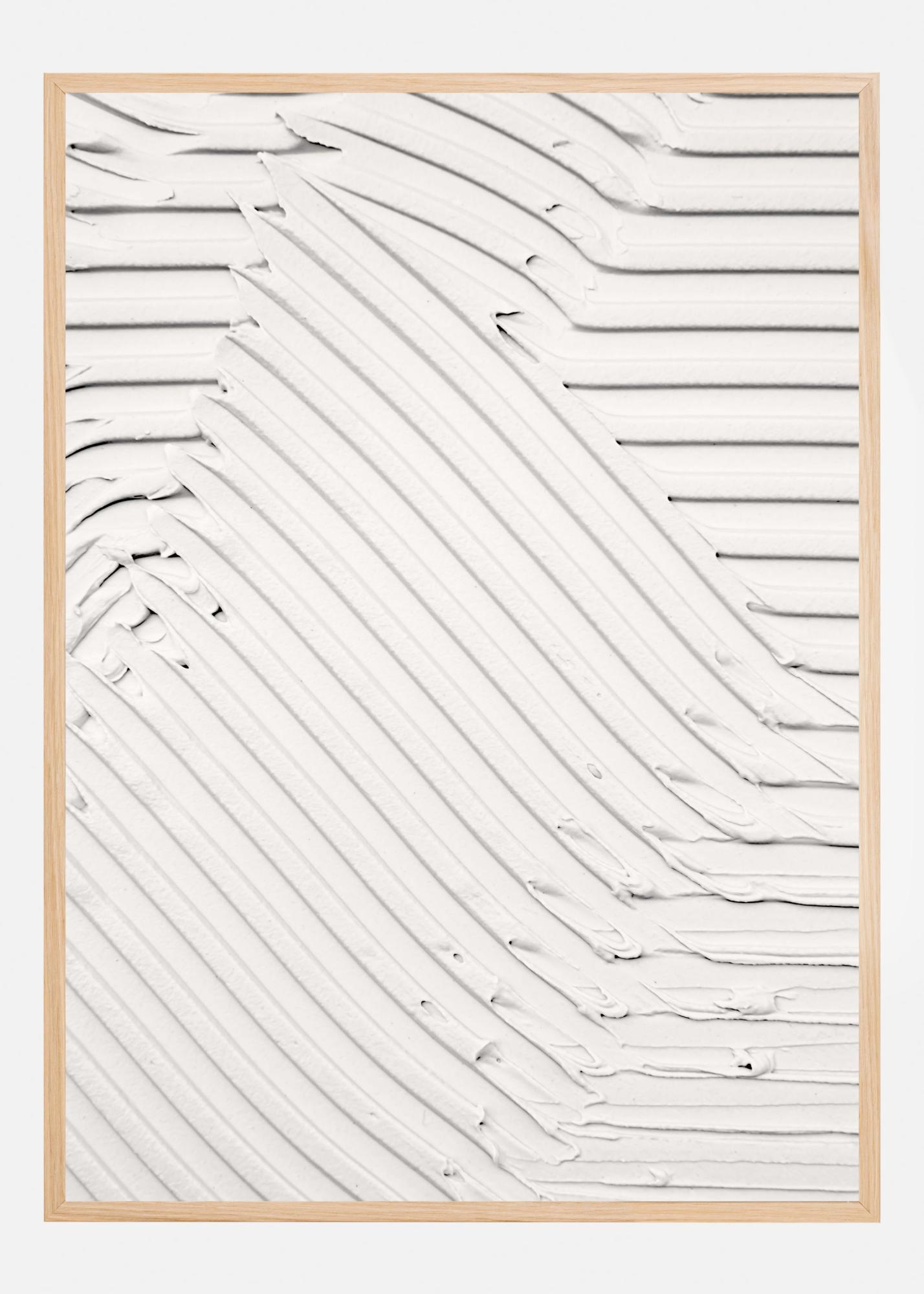 Denna minimalistiska och moderna poster utmärker sig med sin abstrakta representation av texturer och lager. Motivet visar en serie av vad som ser ut att vara vit målfärg eller spackel dragen över en enfärgad yta, vilket skapar en känsla av rörelse och dynamik. Det ren och avskalade uttrycket i vitt mot en subtil bakgrund gör denna affisch till ett perfekt komplement till den skandinaviska inredningsstilen eller en monokrom färgpalett.