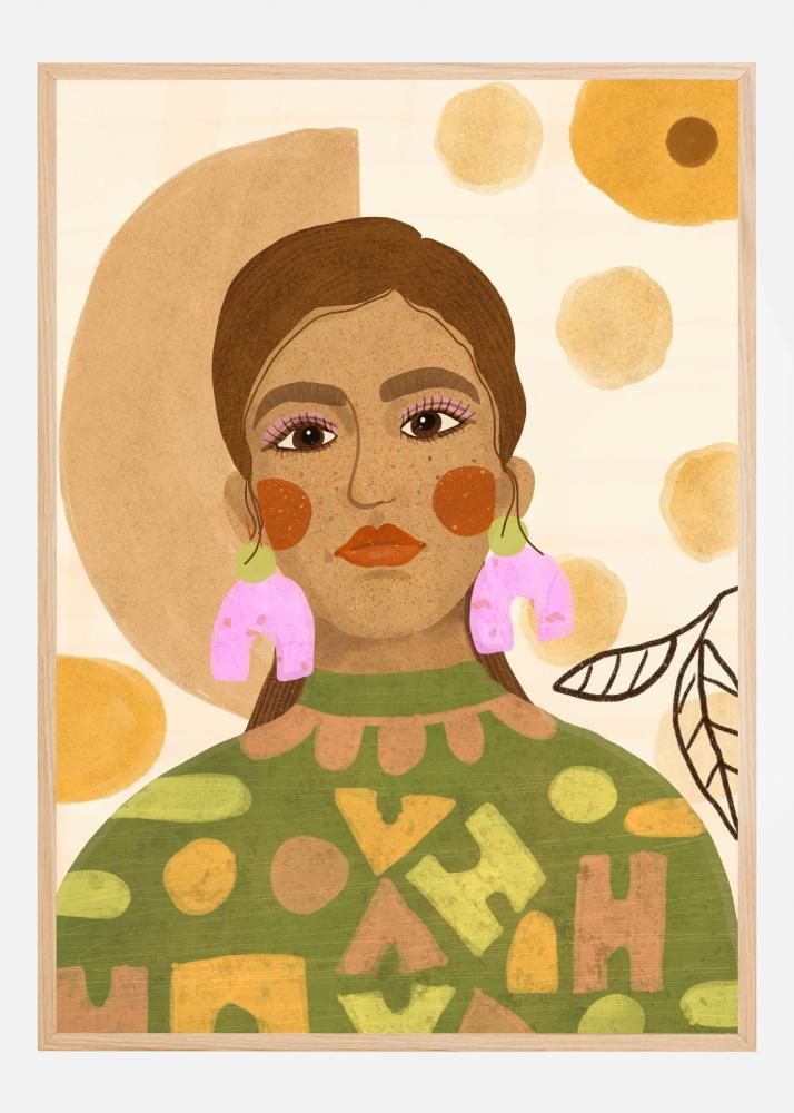Denna konstnärliga poster porträtterar en modern och stilfull illustration av en kvinna, med ett fokus på varma och jordnära toner som framhäver motivets mysiga känsla. Kvinnans ansikte är detaljerat och uttrycksfullt, och hon bär på öronen stora, orange örhängen som adderar en lekfull touch till bilden. Kvinnans gröna tröja är dekorerad med abstrakta former och symboler i en harmonisk komposition som ger liv åt denna unika print.