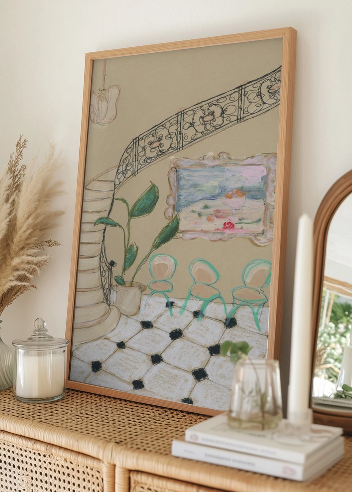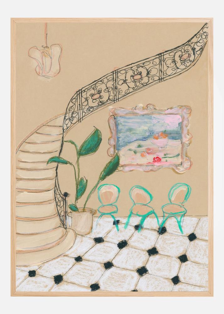 Denna affisch fångar essensen av elegant inredning med ett konstverk som skildrar en klassisk trappa i en stilren miljö. Färgpaletten i denna poster består av mjuka och jordnära toner, med krämfärgad bakgrund som harmoniserar med trappans bruna nyanser. Konstverket är idealiskt för den som söker en stilfull och sofistikerad touch till hemmet och passar väl in i både moderna och traditionella interiörer.