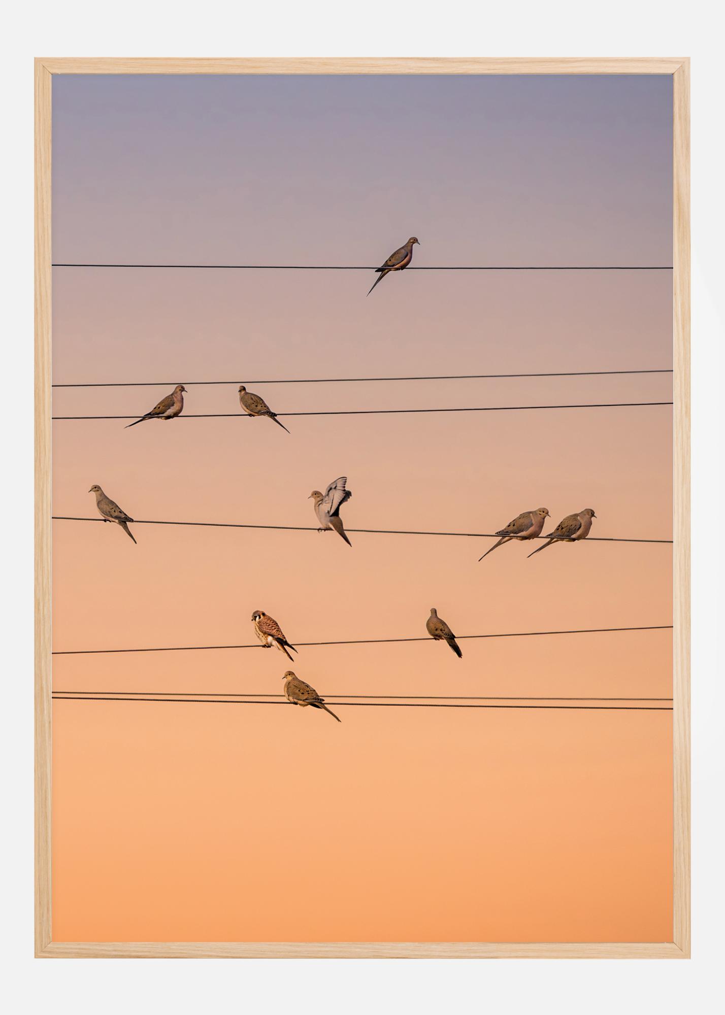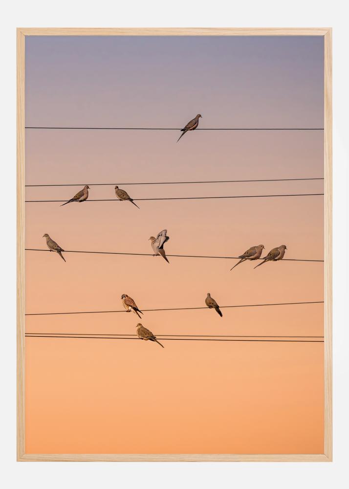 En fantastisk poster med fåglar som sitter på elkablar i en orange solnedgång. Fåglarna och elledningarna påminner om ett notblad som för tankarna tillfågelsång. Den här bilden passar bra på alla vardagsrumsväggar.