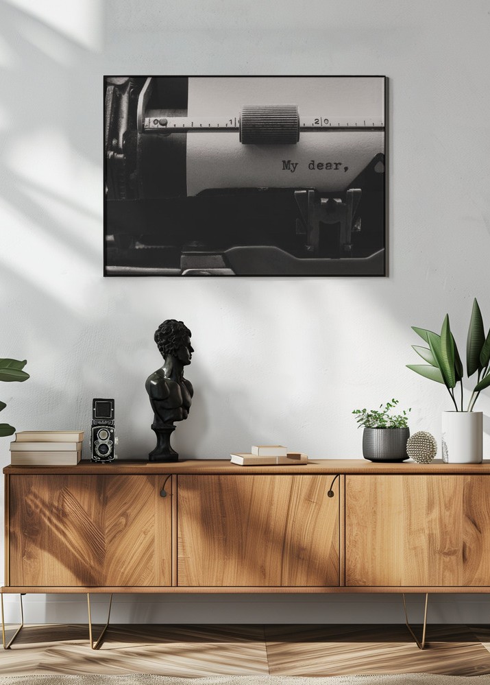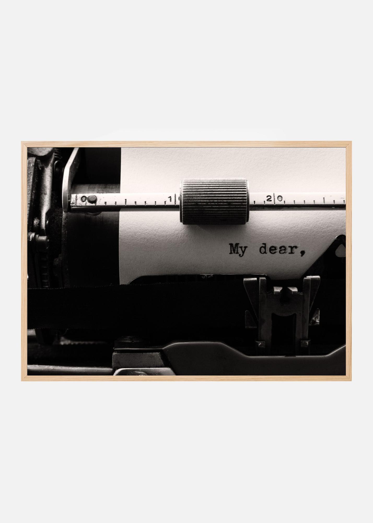 Denna stilrena poster fångar nostalgins charm med en närbild av en skrivmaskin. Bilden visar en detaljrik vy där texten "My dear," framträder på papperet, vilket ger en känsla av tidlös elegans och personlighet. Denna print är perfekt för den som älskar retroestetik och vill ge sitt hem en touch av historisk känsla.