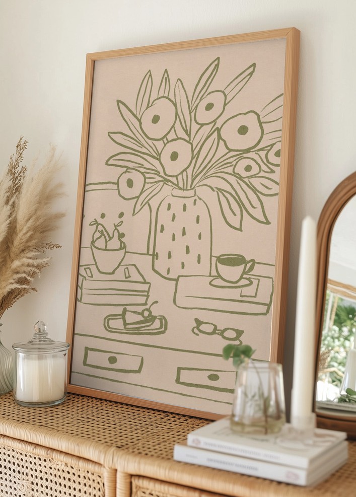 Denna poster fångar ett stilrent och minimalistiskt motiv med mjuka, jordnära toner. Motivet visar en elegant vas fylld med stiliserade blommor och bredvid står en kopp och flera böcker, vilket ger en känsla av lugn och harmoni. Perfekt för att addera en modern touch till ditt hem eller kontor.