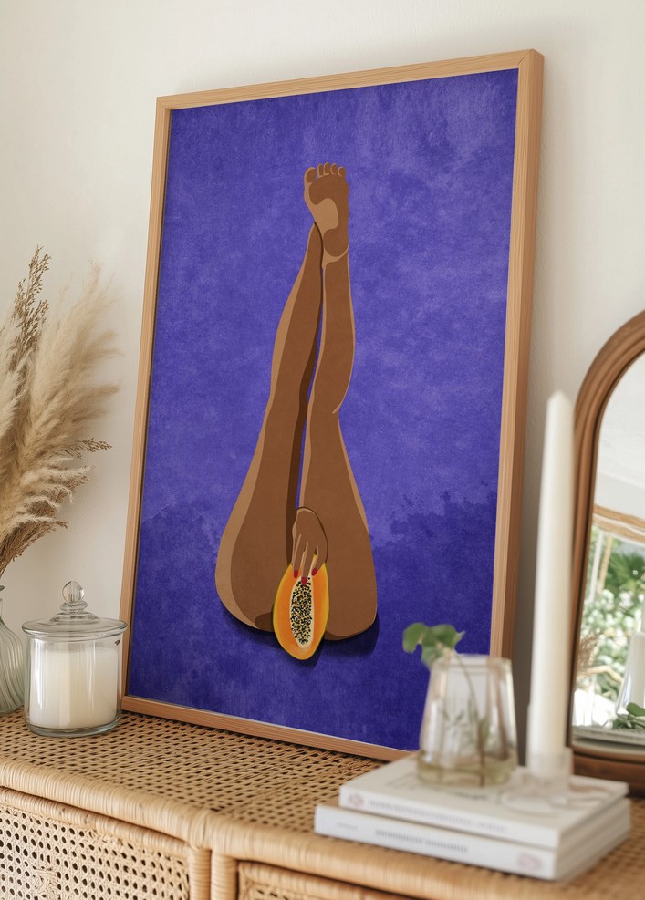 Denna poster erbjuder ett stilfullt och unikt motiv med fokus på skönhet och välmående. Motivet visar två ben som sträcker sig vigt uppåt mot en bakgrund av djupt lila toner, vilket ger en känsla av både elegans och mystik. I bilden håller personens händer en halverad papaya, vilket tillför en exotisk touch och kompletterar det konstnärliga uttrycket.