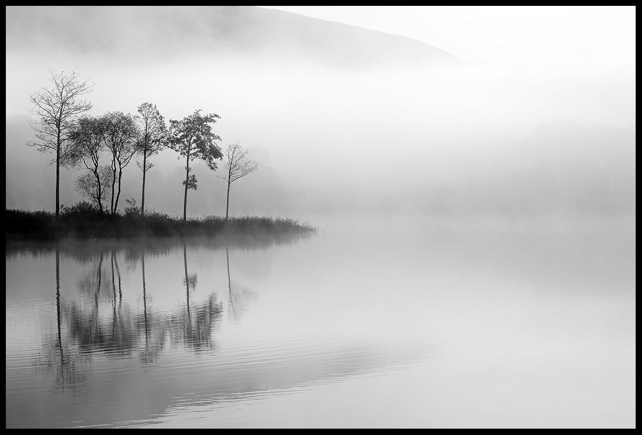 Svartvit fotoaffisch med ett stilrent grafisk motiv i form av några kala träd som speglar sig i krusningarna på vattenytan. Fotografiets rofyllda motiv, omslutet av en tjock grå dimma, gör att det passar in i alla typer av miljöer och inredningsstilar. Affischen är fin att hänga tillsammans med ett inspirerande citat eller andra svartvita naturbilder. Köp till en fotoram som lyfter fram fotografiet på ett bra sätt och som matchar den övriga inredningen i rummet där tavlan ska hänga.