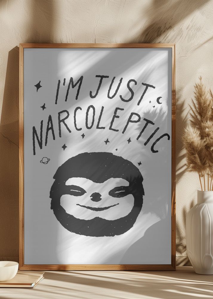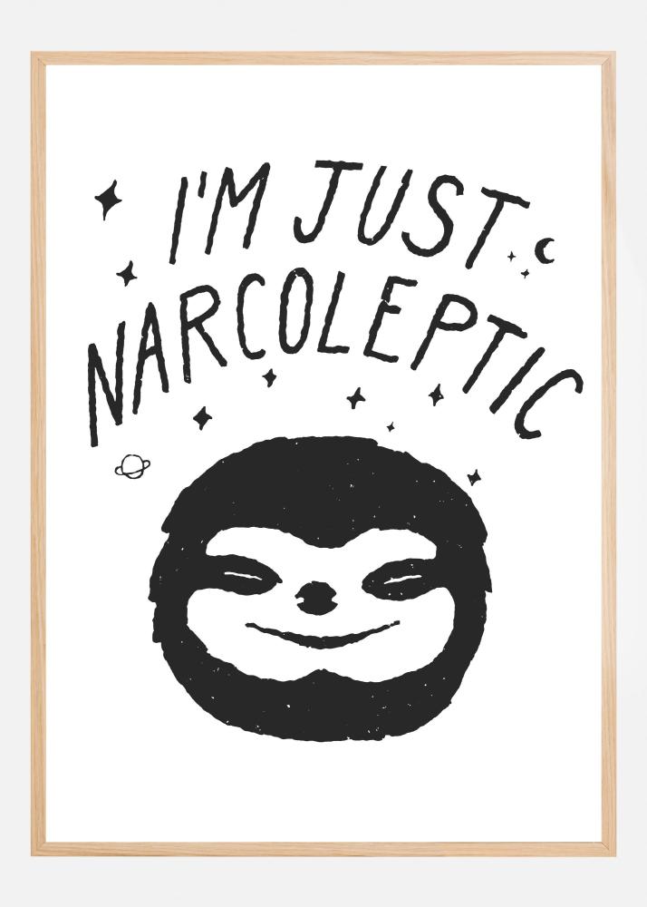 Denna lekfulla och uttrycksfulla affisch framvisar en avslappnad karaktär med texten "I'M JUST NARCOLEPTIC" omringad av stjärnor. Den simpla och samtidigt slagkraftiga designen kombinerar humor och stil på ett unikt sätt, vilket gör det till ett perfekt tillskott för den som vill addera en personlig och lite humoristisk touch till sitt hem eller kontor.