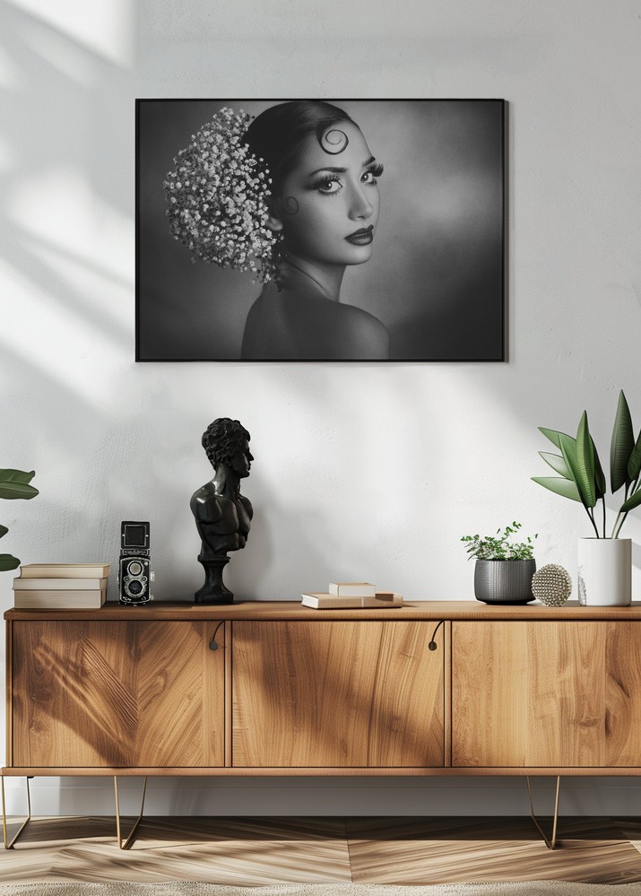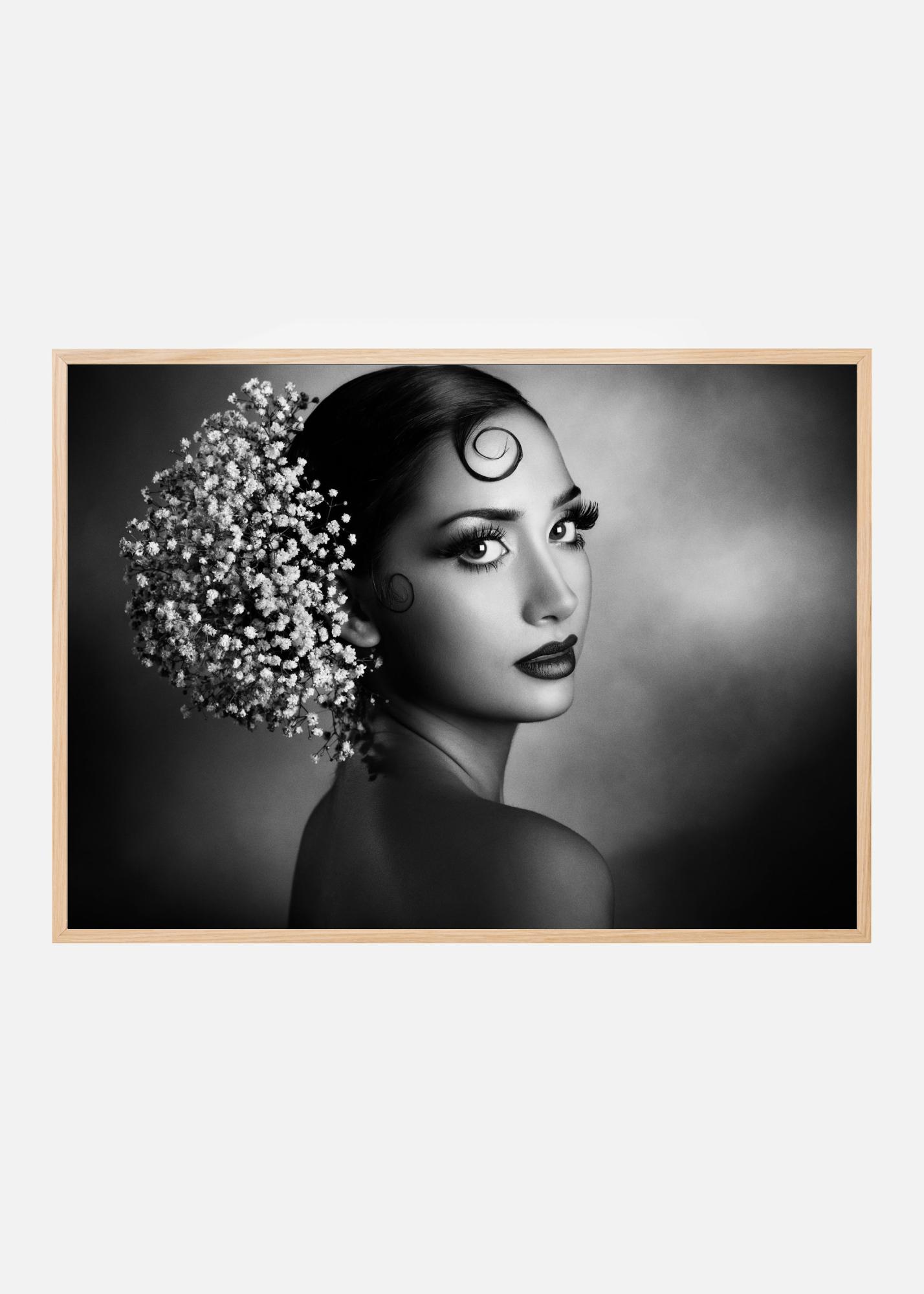 Denna eleganta affisch fångar essensen av tidlös skönhet med ett porträtt i svartvitt. Med en fascinerande blick och sofistikerade detaljer, skapar den en känsla av mystik och elegans. Perfekt för dem som vill att deras inredning ska återspegla en känsla av stilfull enkelhet, denna poster är idealisk för moderna och klassiska miljöer.