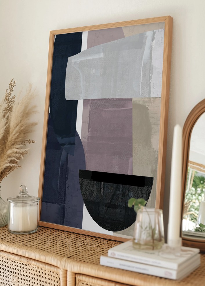 Färgpaletten i denna print består av en subtil kombination av mörkblått, lila, gräddvit, och svart, vilket bidrar till dess eleganta och tidlösa estetik. De gedigna färgerna samspelar för att ge ett djup och en rik känsla, vilket gör denna poster till ett perfekt komplement för att lyfta atmosfären i ditt hem. Låt detta konstverk bli en central del av din väggdekor.